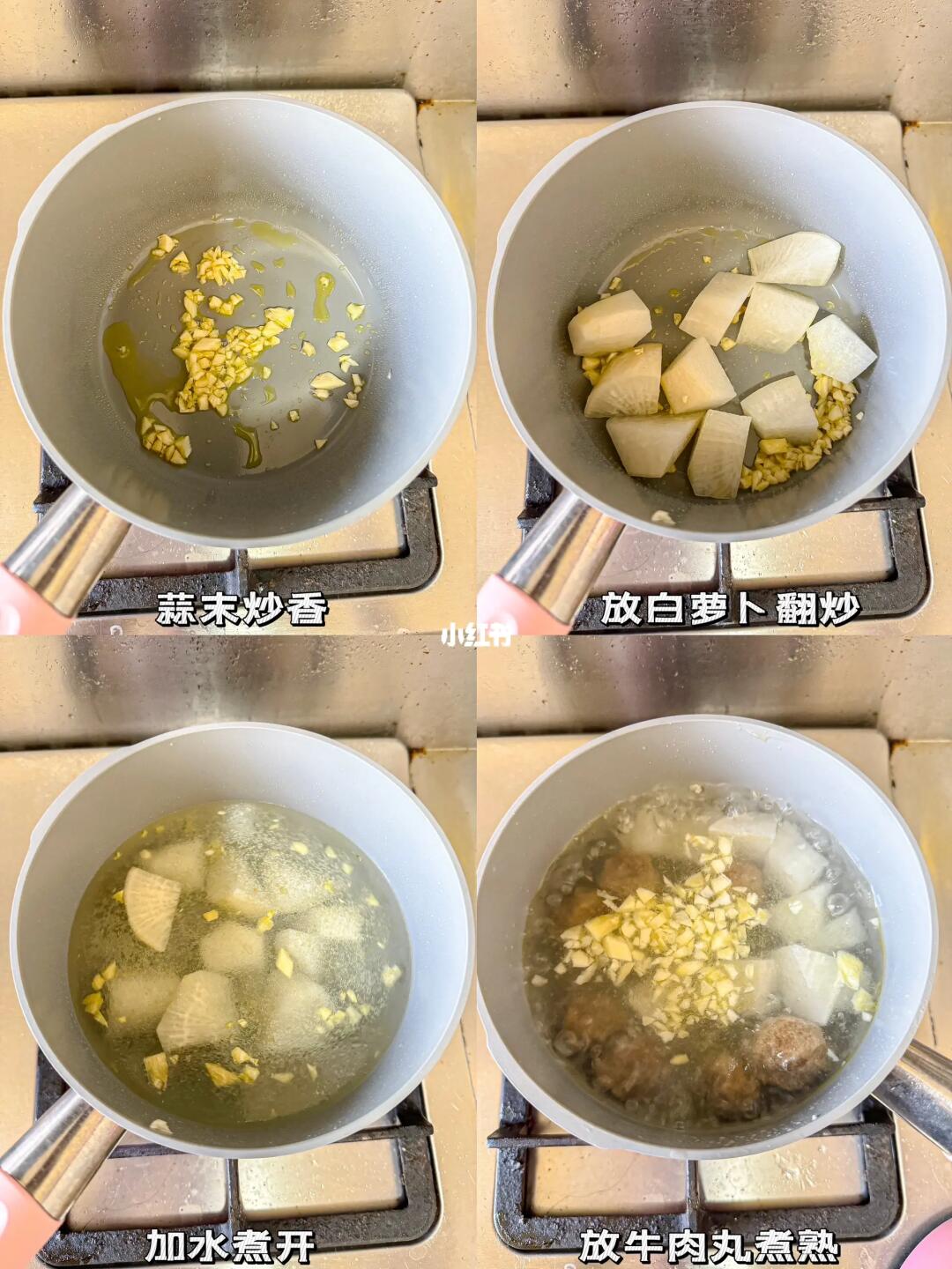 天冷啦,就想喝点暖暖的汤 超级简单又鲜美的白萝卜牛肉丸汤 📋食材:白萝卜/牛肉丸/蒜末/蒜头酥 👩🏻🍳制作: 1️⃣白萝卜切滚刀块 2️⃣蒜末炒香,放白萝卜翻炒 3️⃣加水煮开后白萝卜煮5分钟 4️⃣放入牛肉丸再煮5分钟 5️⃣加适量的盐和松鲜鲜 最后撒上蒜头酥