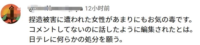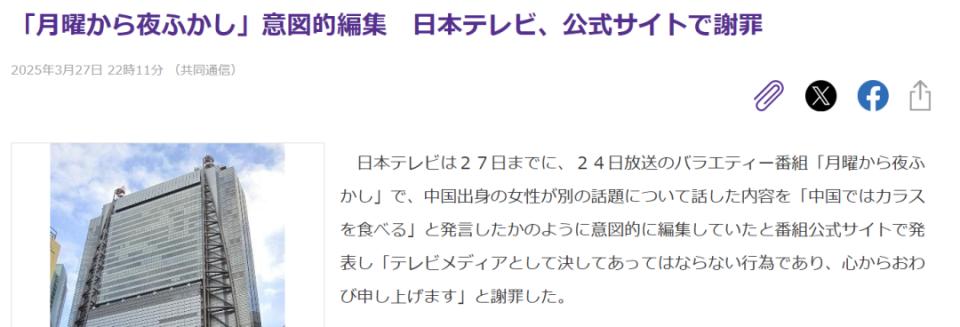 据悉,该节目将一中国女子受访时说的两句话恶意剪辑在一起,营造出“中国人吃乌鸦”的观感。由于乌鸦在日本被视为祥瑞,导致这名中国女子遭受网暴,被大量日本网民侮辱攻击。