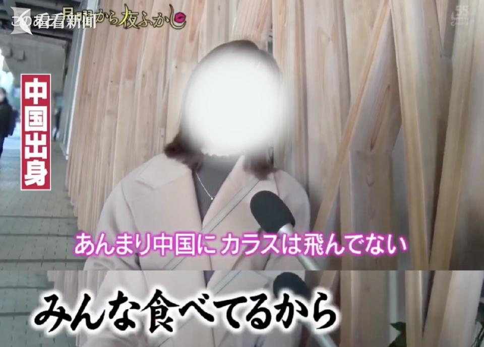 谈及乌鸦时,这名女生称东京乌鸦很多,衣架都被叼走了,在中国不会看到这么多乌鸦,来自广州的她还提到了鸽子,说中国人会吃鸽子,开玩笑称“被煮掉吃完了”。