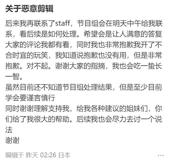 3月27日,该节目组所属日本电视台在官网用中日双语道歉称,这名女生从未说过“中国人吃乌鸦”,制作团队恶意剪辑完全歪曲了她的本意。道歉称,这是电视媒体不可饶恕的错误,对这名女生和所有观众表示最诚挚的道歉,今后将全面审查防止再犯。