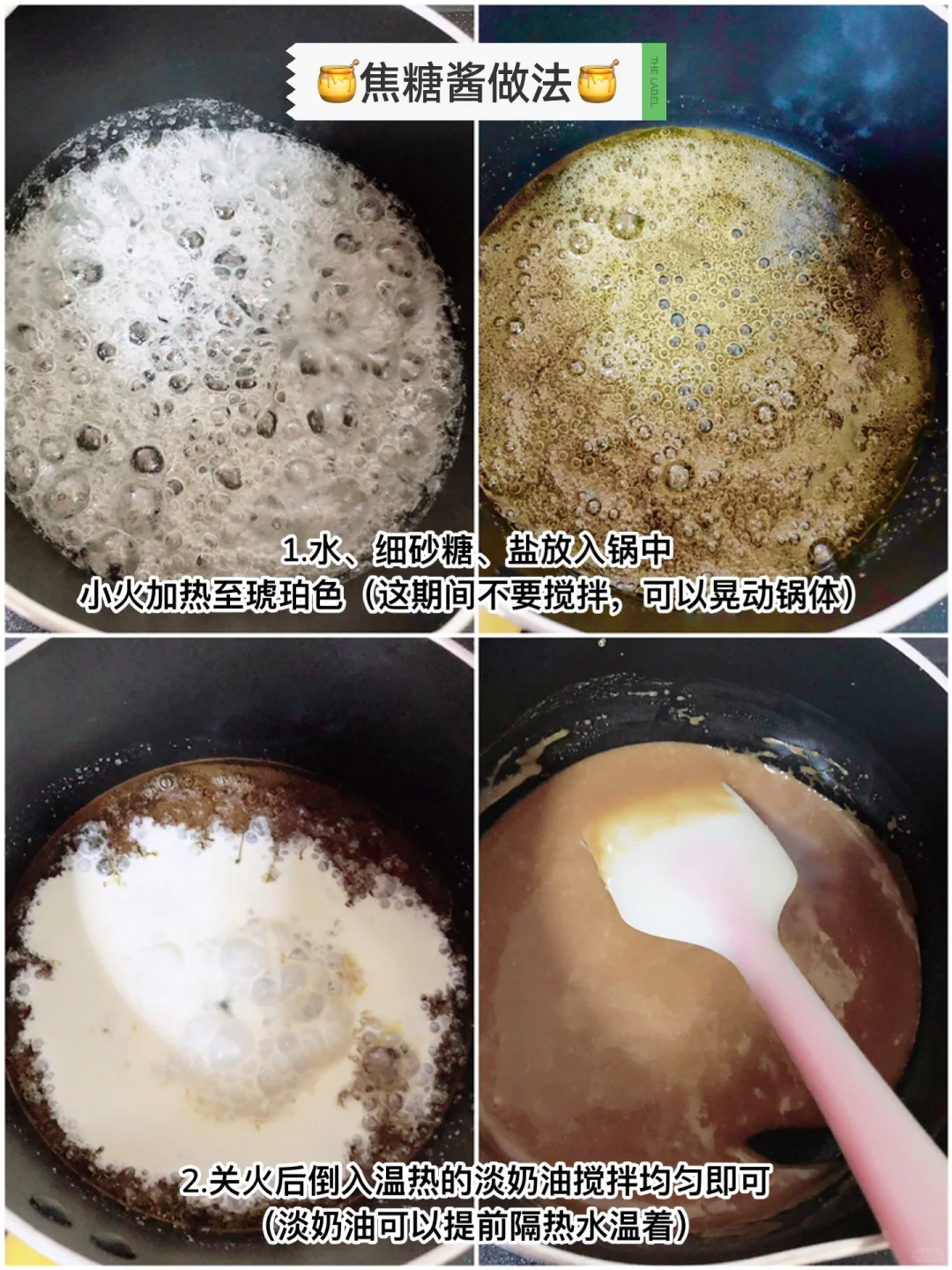 1️⃣淡奶油提前隔热水温着。将水、细砂糖、盐放入锅中小火加热至琥珀色关火(期间不要搅拌),倒入温热的淡奶油搅拌均匀后晾凉备用