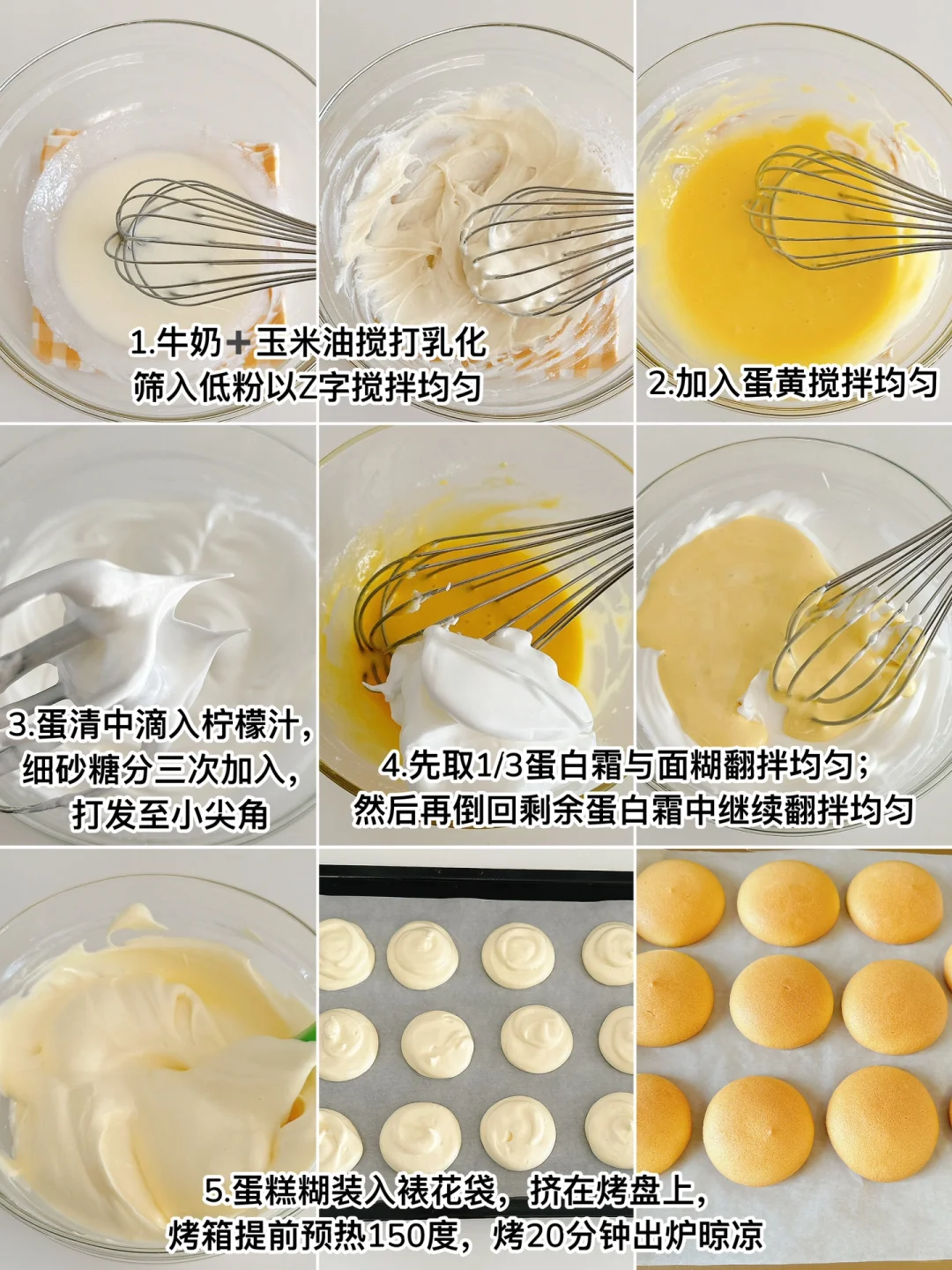 4️⃣取1/3蛋白霜与面糊翻拌均匀,再倒回剩余的蛋白霜中继续翻拌均匀后装入裱花袋挤入烤盘,烤箱提前预热150度,烤20分钟出炉晾凉