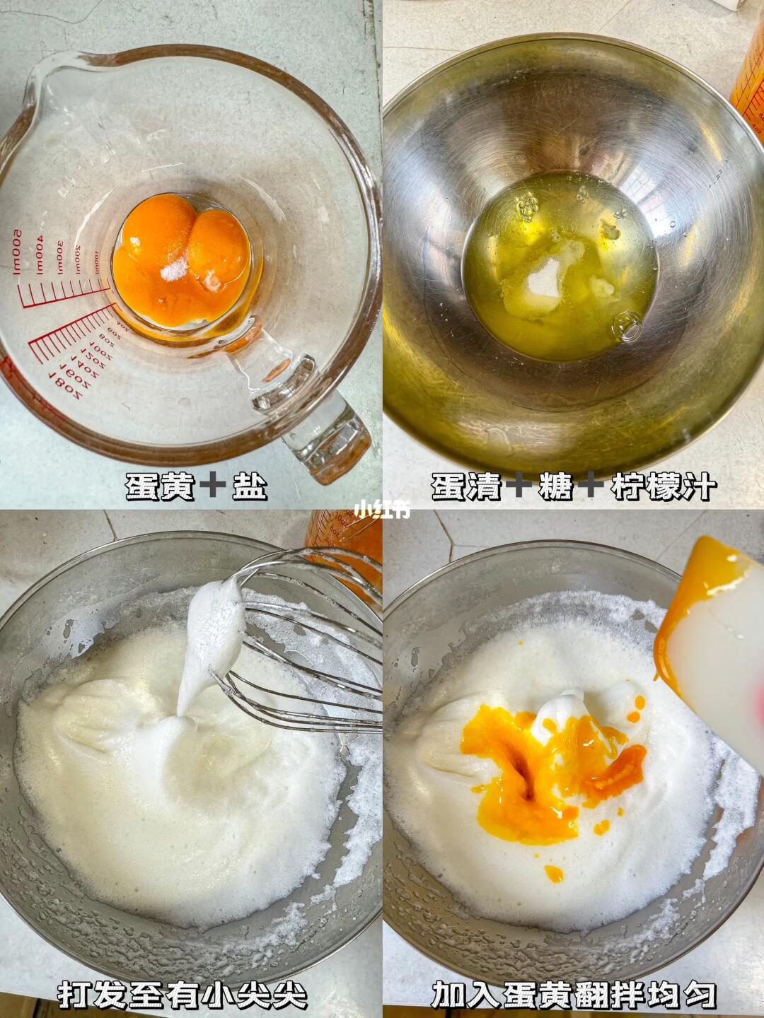 2️⃣蛋黄➕盐搅拌均匀,蛋清➕糖➕柠檬汁用打蛋器打发至有小尖尖