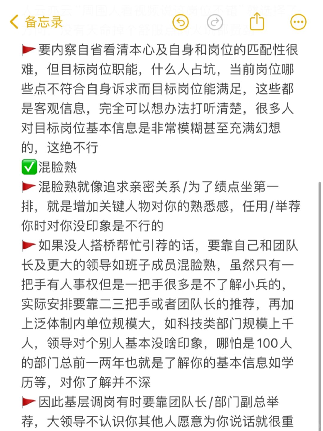 🚩重中之重,很多人要调岗前没做好信息战,只知道本岗位不喜欢,但喜欢/想要什么有什么资源禀赋,甚至目标岗位是干什么的都毫无了解,就人云亦云“周围人看视频说这岗位不错”就选择了方向,没有天命掉个舒服点的火坑都费劲