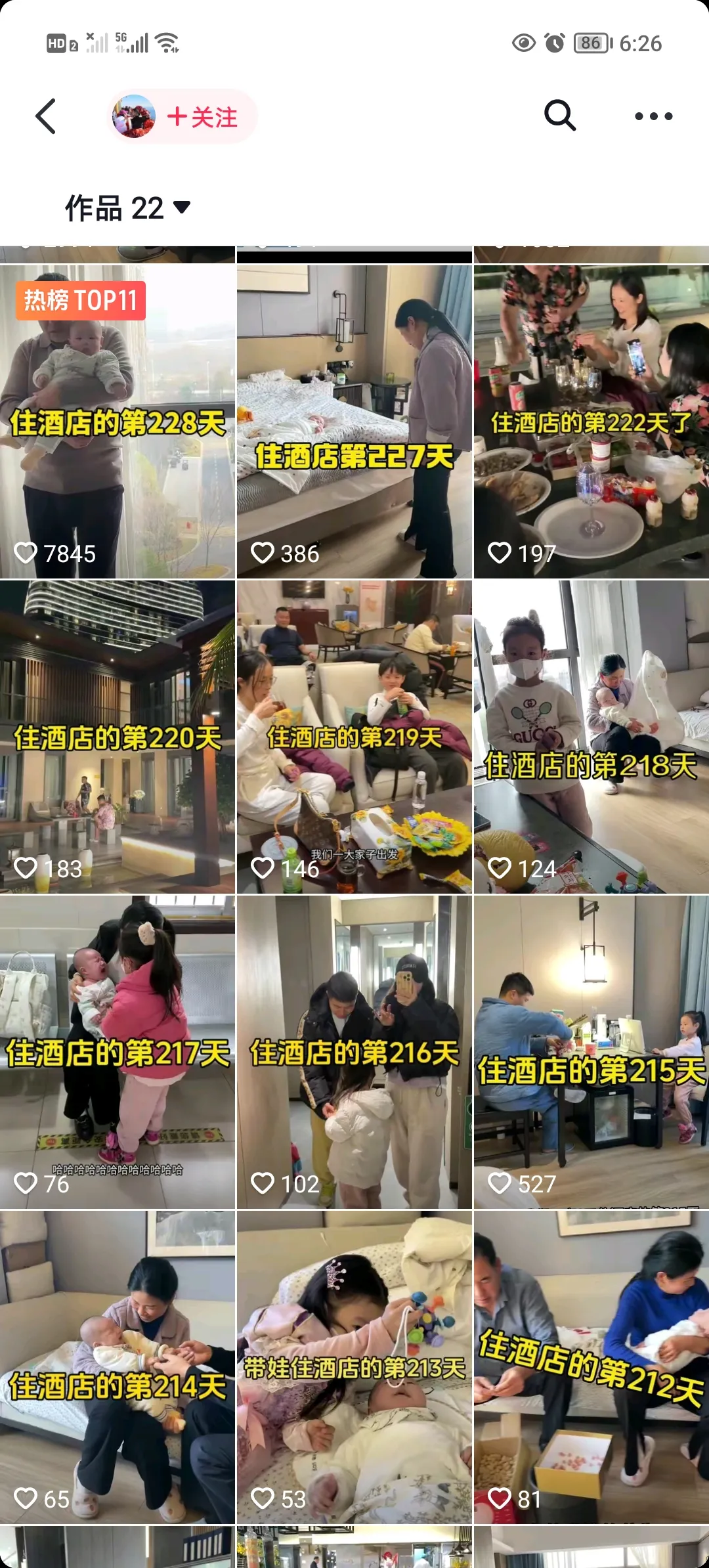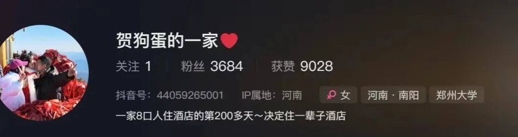 果然有猫腻!一家八口住酒店229天,房费一天1000块,更多内幕被扒! 网友透露女子老公原来是某手的网红贺仔,有着1400万的粉丝。2019年结婚后因为账号被封禁以及解除合同等原因就渐渐消淡出网友视野,这样的大网红想必深谙流量密码! 而且这名女子账号上发的全部都是住酒店的视频,标题都是一样的,都是一家八口住酒店的第XX天这样的。疑似在炒作,绝不是如女子所言随意发的!