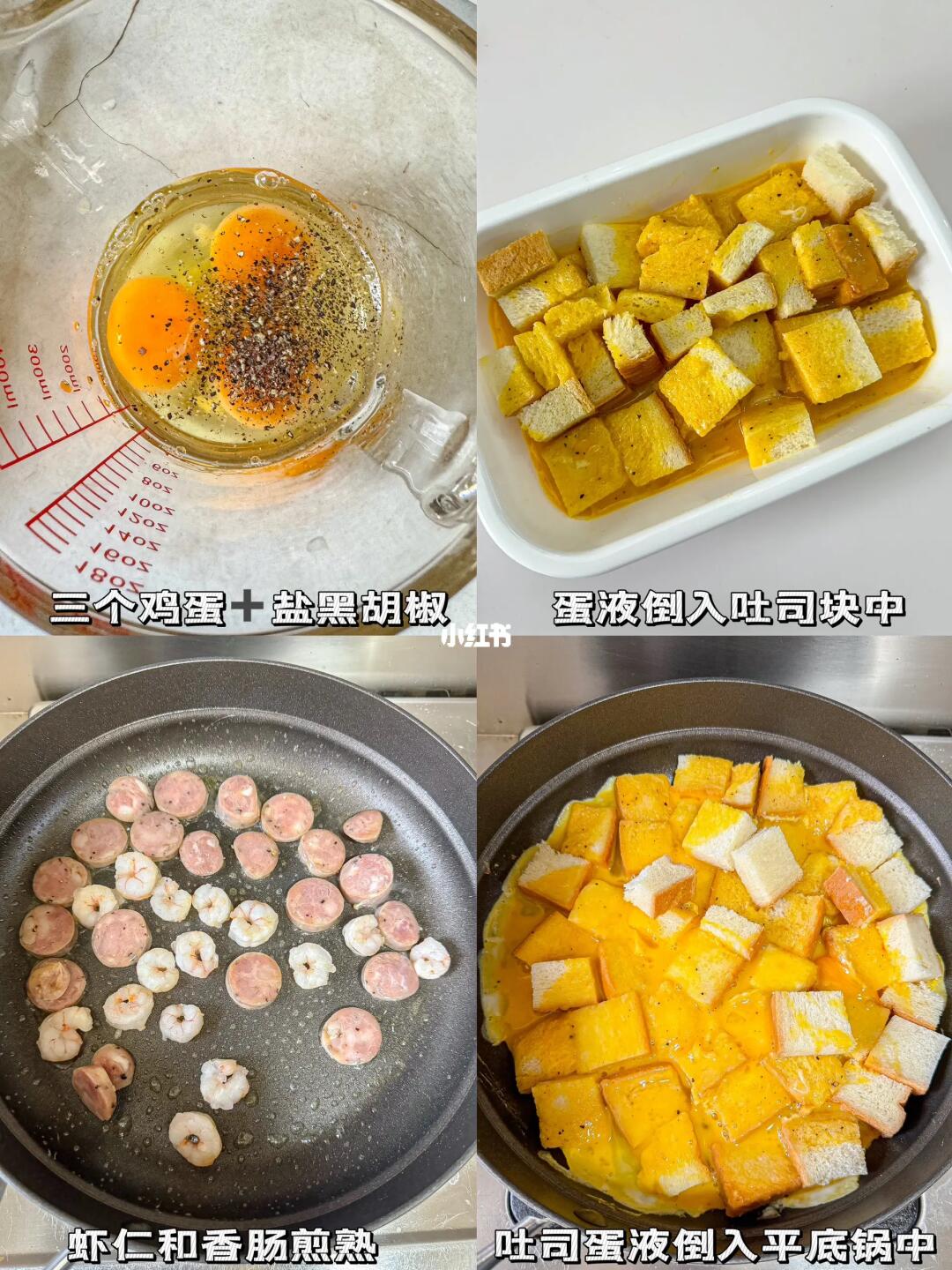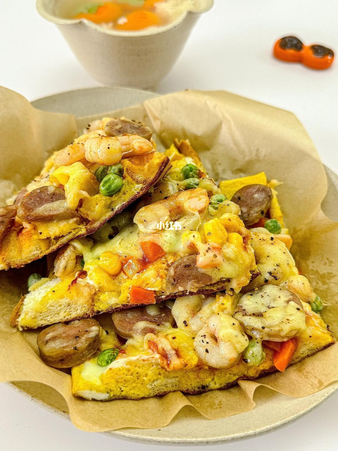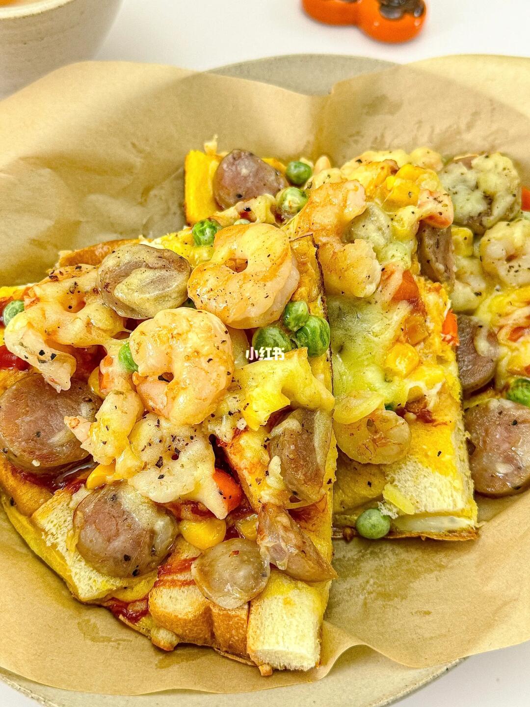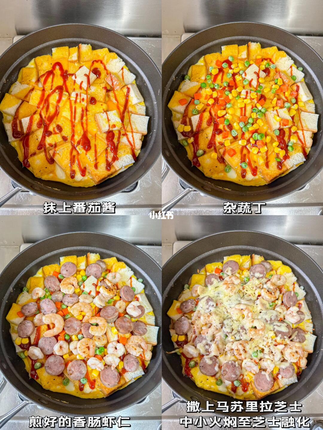 平底锅就能轻松搞定的懒人披萨🍕 食材: 吐司三片🍞(根据锅的大小) 香肠🌭 鸡蛋三个🥚 虾仁🍤 杂蔬丁🥕 👩🏻🍳制作: 1️⃣吐司切丁 2️⃣三个鸡蛋➕盐➕黑胡椒打散,倒入吐司中 3️⃣虾仁和香肠煎熟备用 4️⃣吐司丁倒入平底锅中煎至定型,抹上番茄酱 5️⃣撒上杂蔬丁,虾仁,香肠 6️⃣撒上马苏里拉奶酪,中小火盖盖子焖至芝士融化