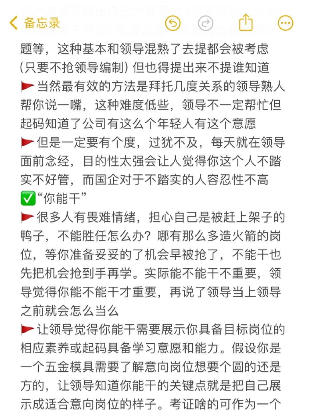 🚩很多人有畏难情绪,担心自己是被赶上架子的鸭子,不能胜任怎么办?哪有那么多造火箭的岗位,等你准备妥妥的了机会早被抢了,不能干也先把机会抢到手再学。实际能不能干不重要,领导觉得你能不能干才重要,再说了领导当上领导之前就会怎么当么