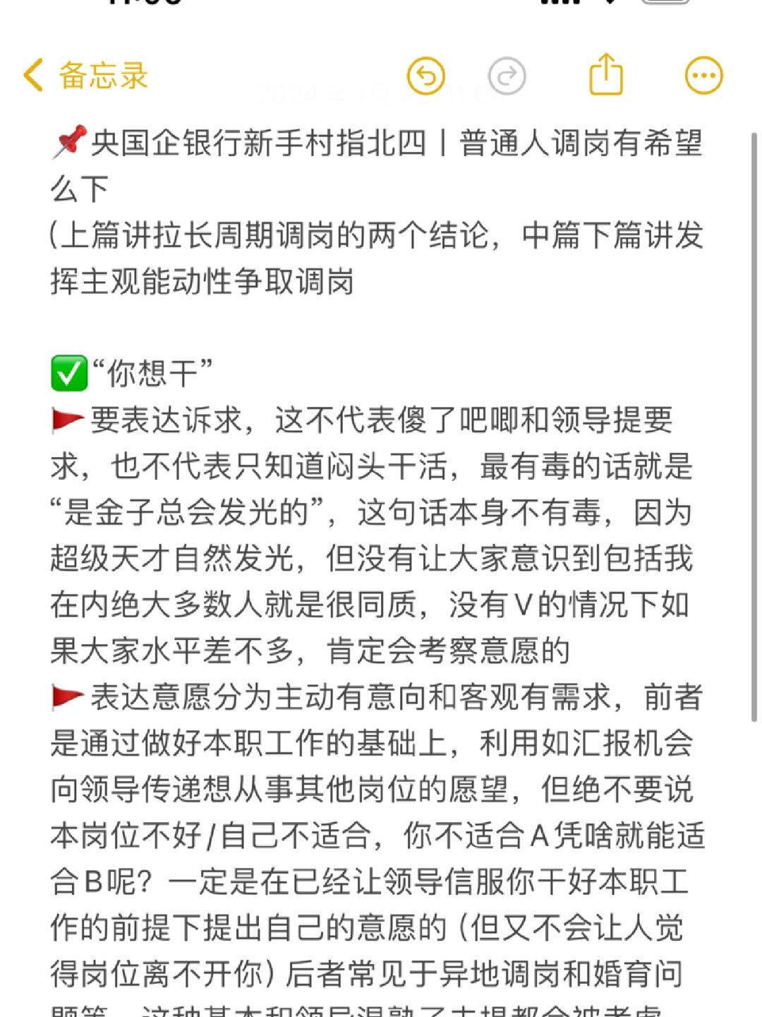 🚩表达意愿分为主动有意向和客观有需求,前者是通过做好本职工作的基础上,利用如汇报机会向领导传递想从事其他岗位的愿望,但绝不要说本岗位不好/自己不适合,你不适合A凭啥就能适合B呢?一定是在已经让领导信服你干好本职工作的前提下提出自己的意愿的(但又不会让人觉得岗位离不开你)后者常见于异地调岗和婚育问题等,这种基本和领导混熟了去提都会被考虑(只要不抢领导编制)但也得提出来不提谁知道