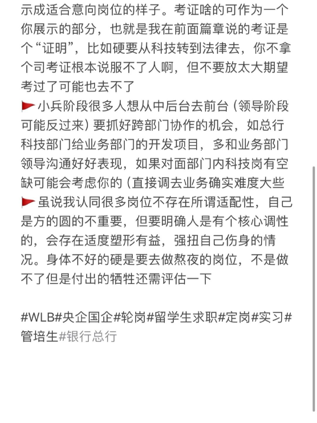 🚩小兵阶段很多人想从中后台去前台(领导阶段可能反过来)要抓好跨部门协作的机会,如总行科技部门给业务部门的开发项目,多和业务部门领导沟通好好表现,如果对面部门内科技岗有空缺可能会考虑你的(直接调去业务确实难度大些