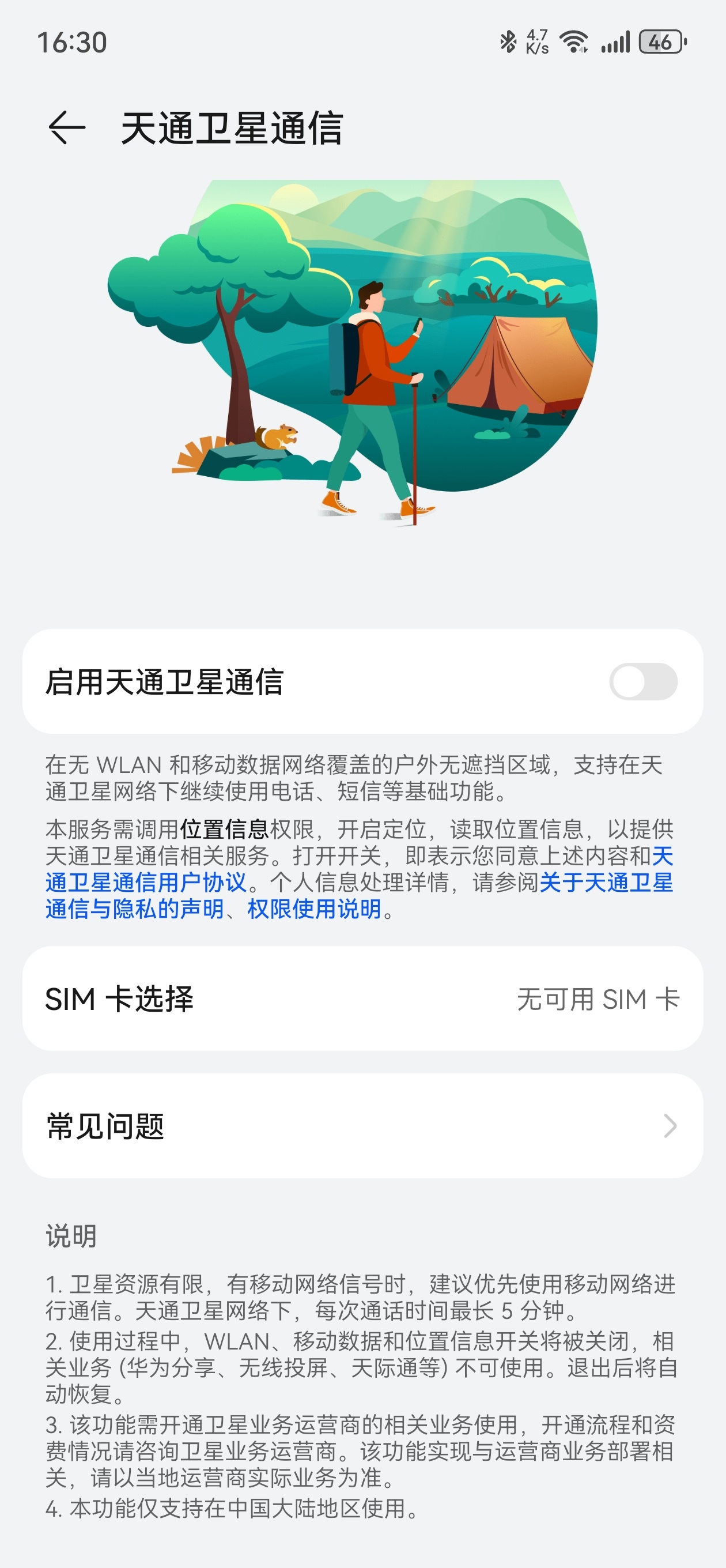 三个缺点,1,拿华为来说,现阶段只有中国电信支持,想要体验该功能需要用电信卡。2,使用条件苛刻,要在空旷无遮挡的地方,搜星成功率会高,并不是大家以为的山洞、雨林、废墟甚至狭小空间里就也能用的(以上条件并非绝对,仅我个人体验)。3,和直接接打电话的,真卫星通信还有距离。