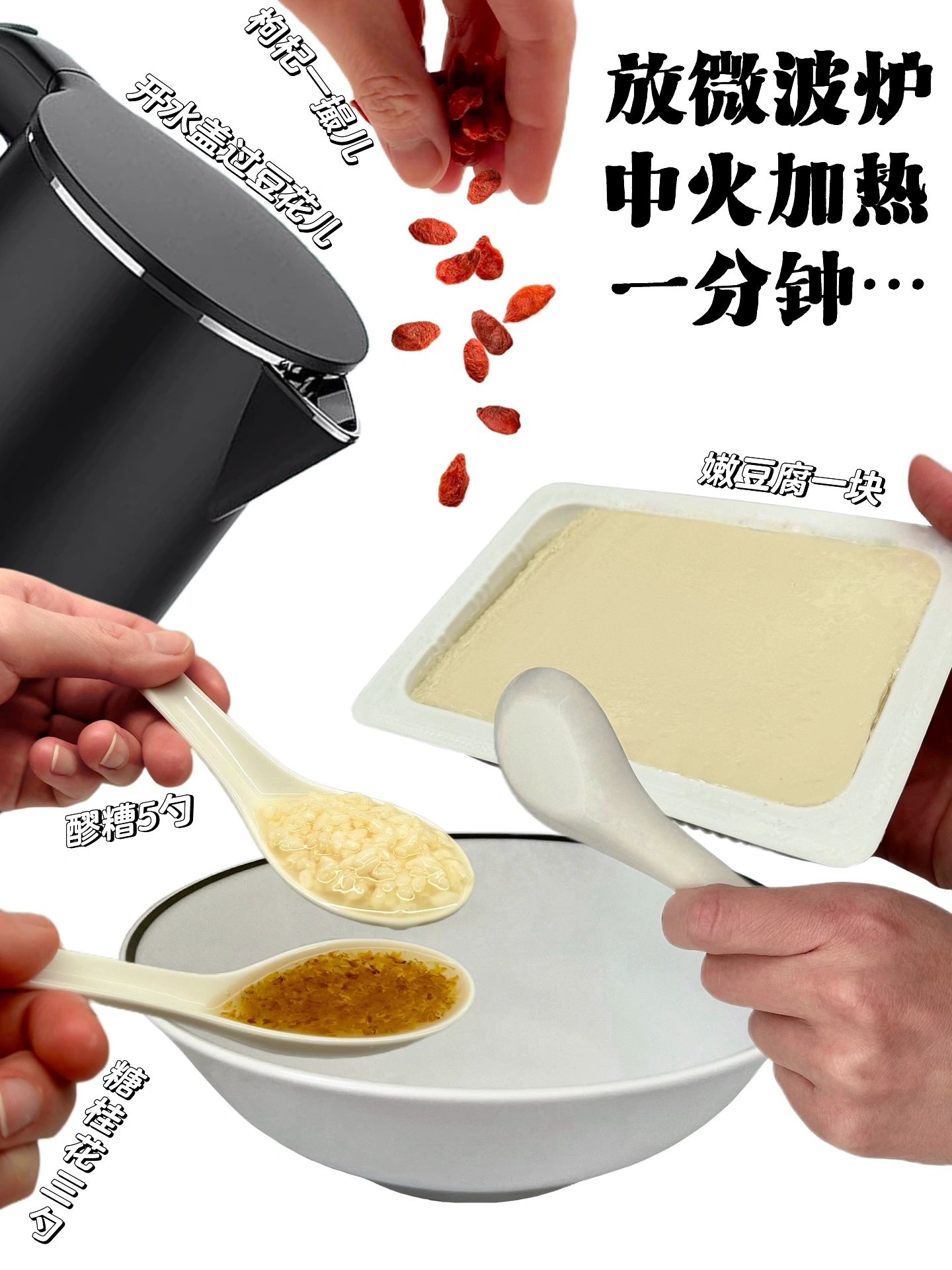 热乎乎的醪糟豆花 入口滑嫩又香甜 一碗下肚 暖暖的好舒服 简直是治愈胃的小确幸😌 👉Tips 甜度🉑根据个人口味调整 葡萄干、花生碎和熟芝麻喜欢也🉑加 有时间还🉑煮个小汤圆加在里面 赶时间的时候🉑装杯子里带着 拿吸管吸着吃 👉冬暖夏凉 醪糟豆花儿既可以冷吃也可以热食 供君挑选[萌萌哒R][害羞R] ⚠️注意 微波炉品牌和型号不同 功率可能会存在差异 具体加热时间🉐根据实际情况进行调整