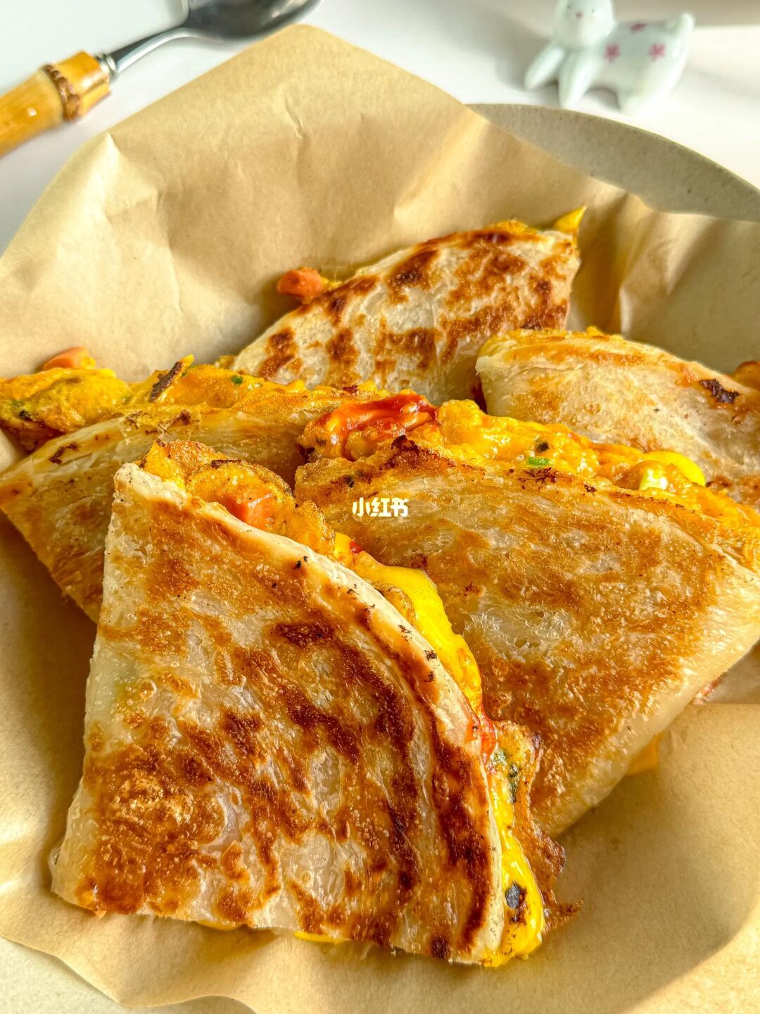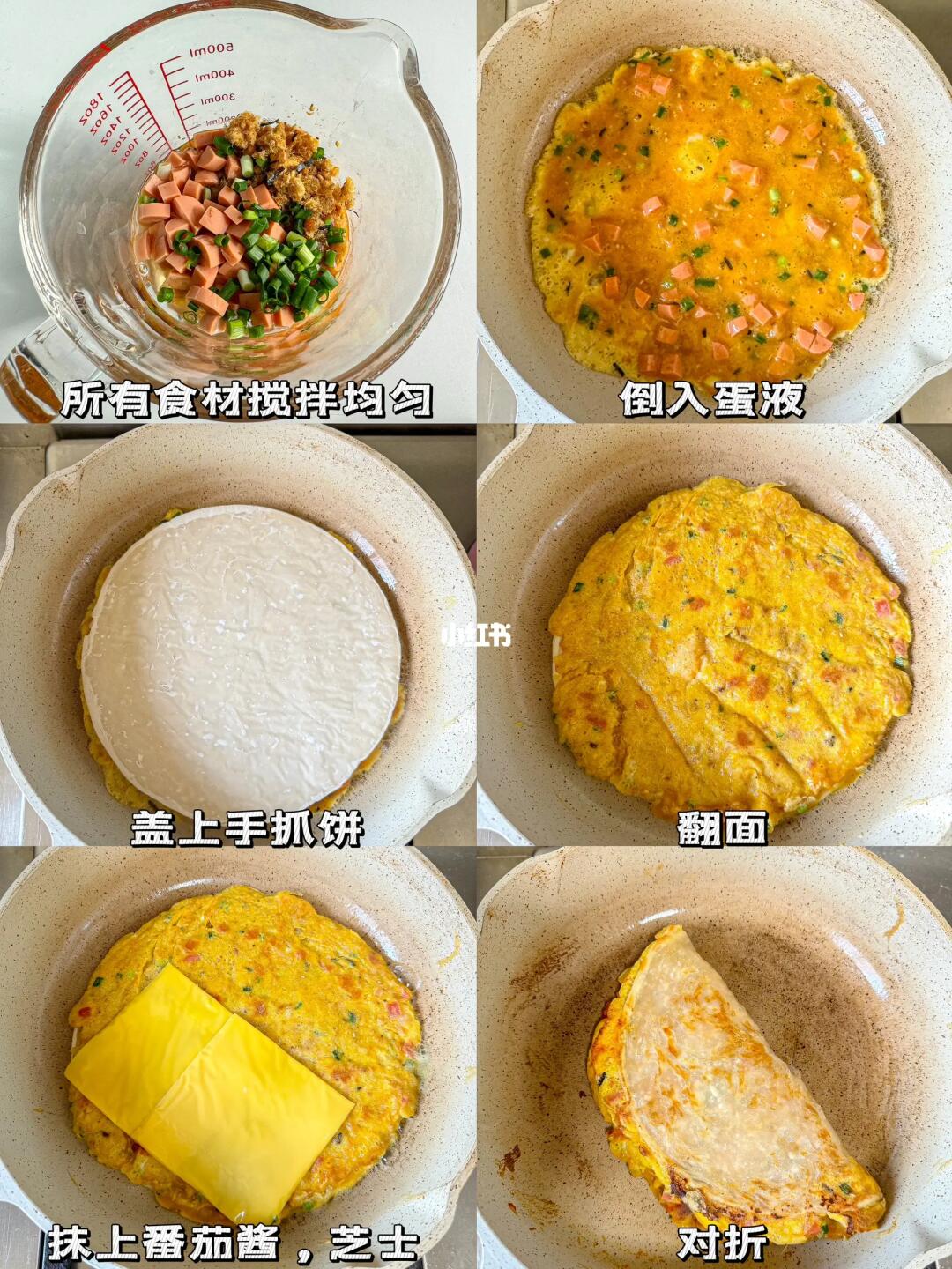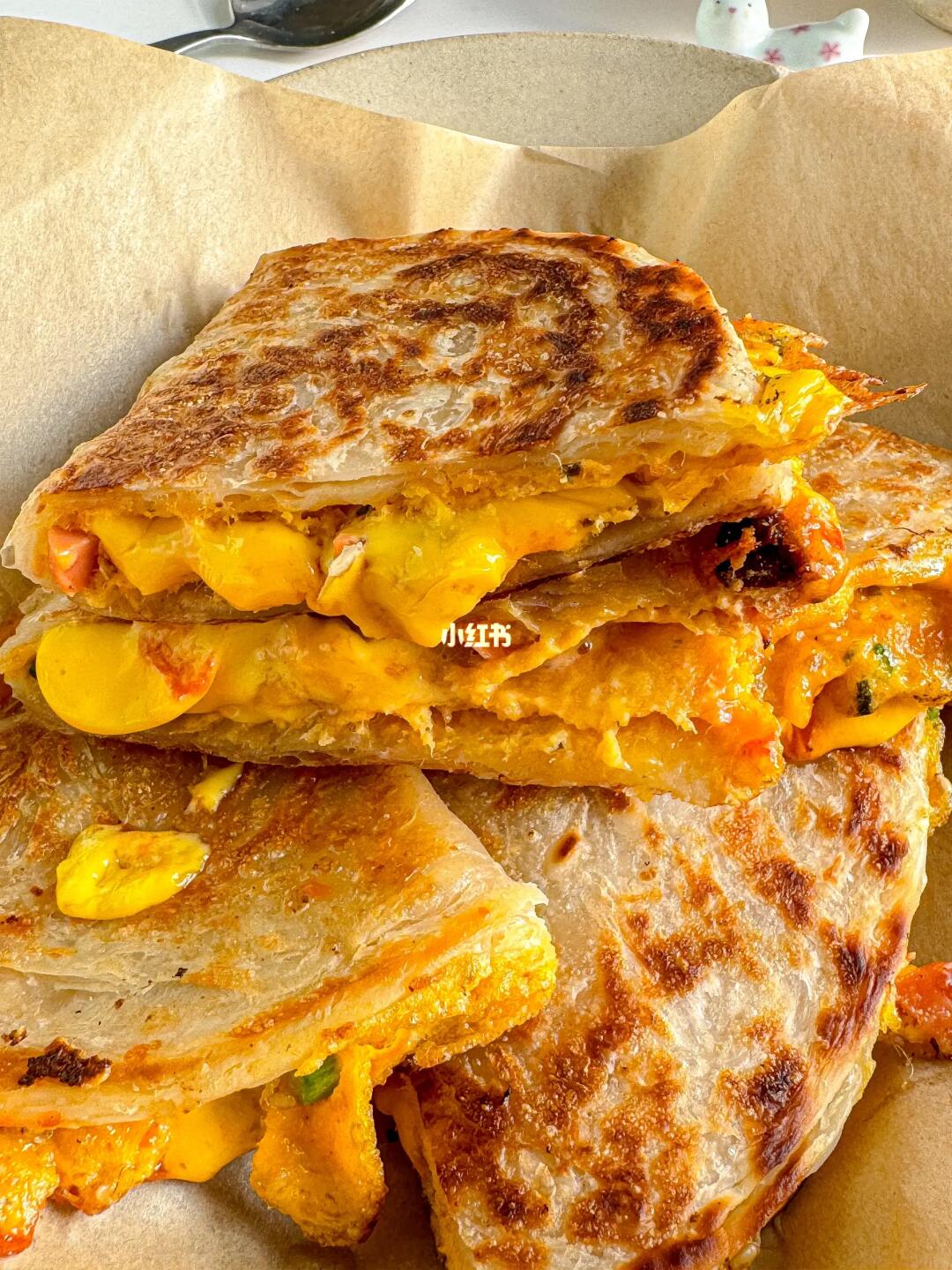 手抓饼的神仙吃法 营养美味快手早餐 葱花火腿鸡蛋肉松手抓饼✖️酒酿小圆子 ❤️食材:葱花/火腿/鸡蛋/肉松/手抓饼/芝士片 ♨️制作: 1️⃣打三个鸡蛋,加入葱花,火腿丁,肉松搅拌均匀 2️⃣平底锅中先加入蛋液,稍微融化放入手抓饼轻轻压一下 3️⃣蛋液稍微凝固住翻面,抹上番茄酱,等手抓饼煎熟,放上芝士片 4️⃣对折手抓饼等芝士稍微融化 取出后切三等份,每一口下去都超级满足,满满的馅料,还有奶香奶香的芝士爆浆