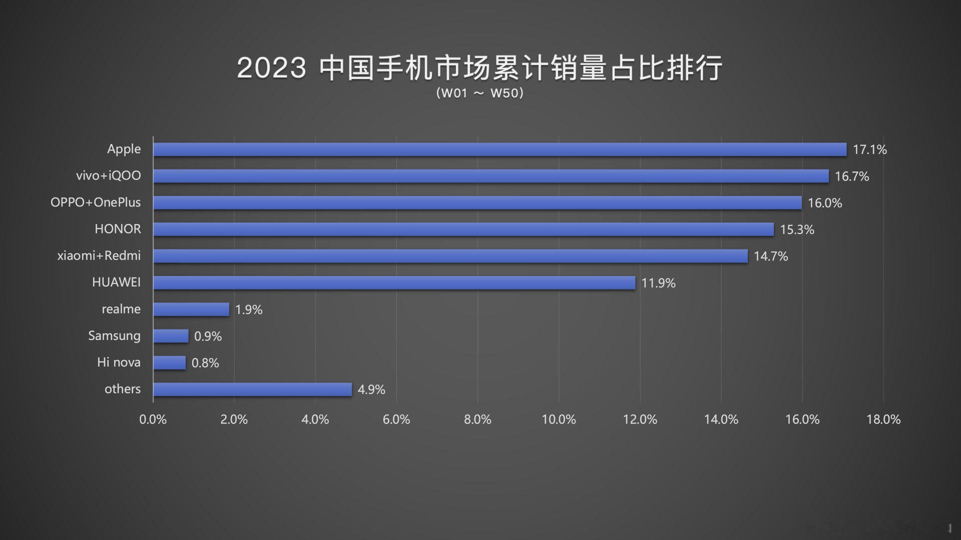 一加中国区总裁李杰在接受记者采访时表示:2023 年一加在中国智能手机市场份额为 2%,小米(不含红米)为 3%,2024 年一加的目标是超过小米(不含红米)国内市场份额。