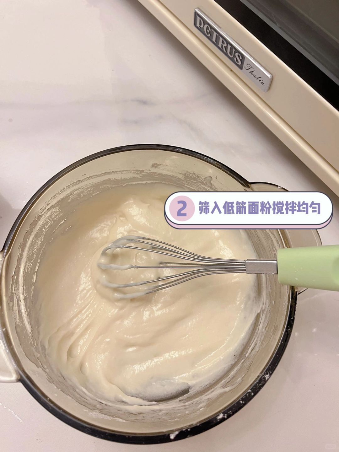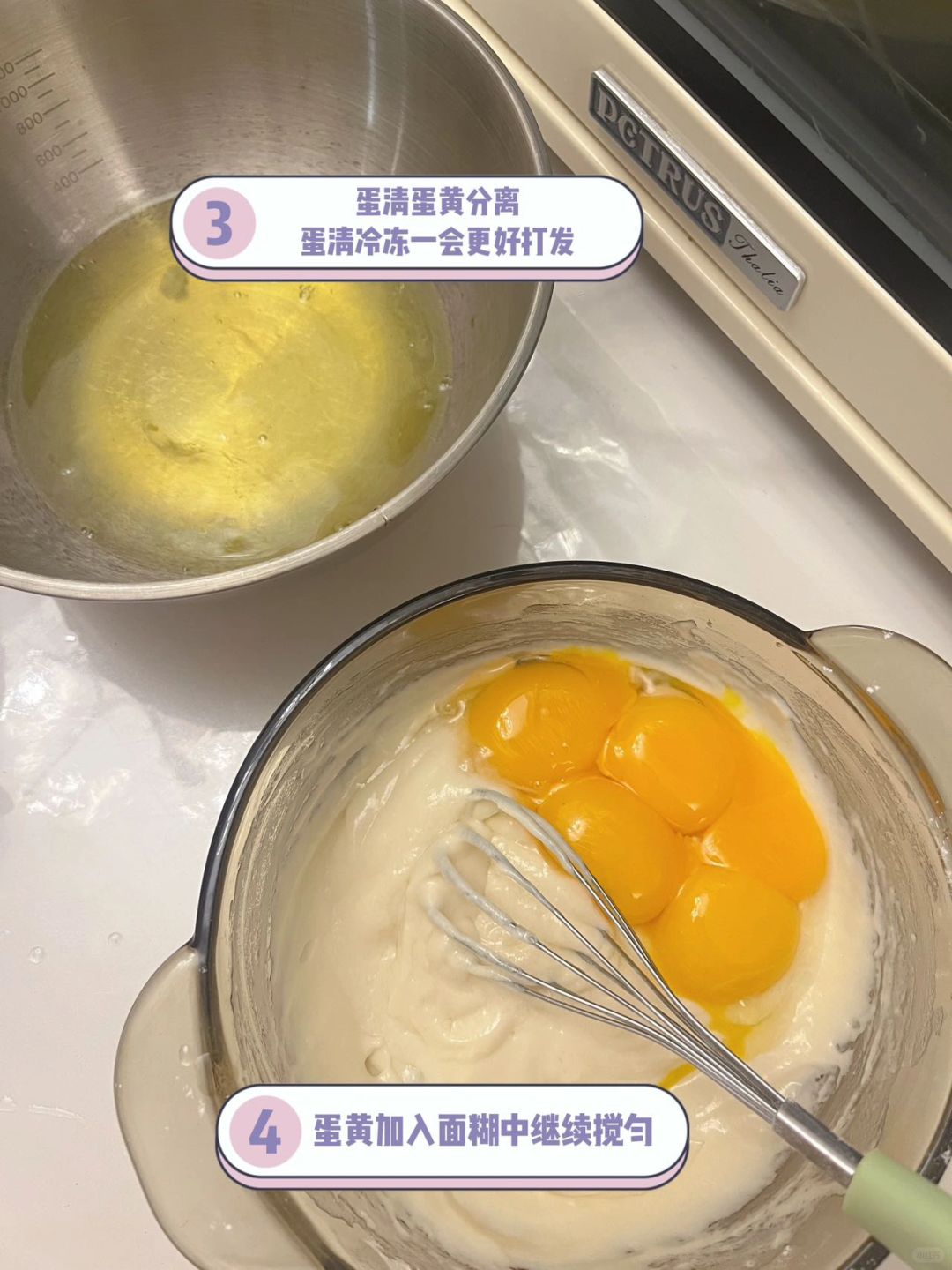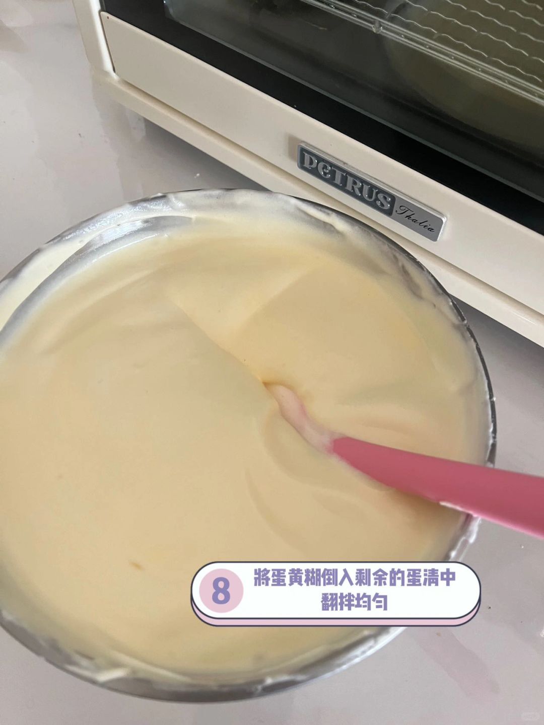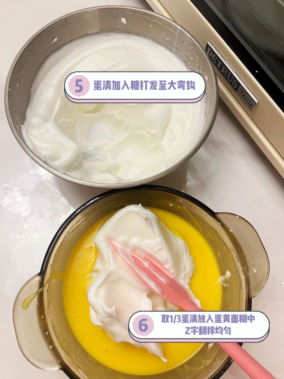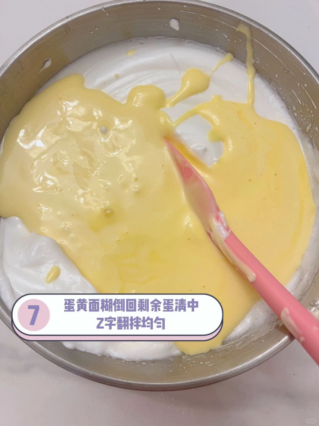 4、取1/3蛋清放入蛋黄糊z字翻拌均匀,倒回剩余蛋清中翻拌均匀
