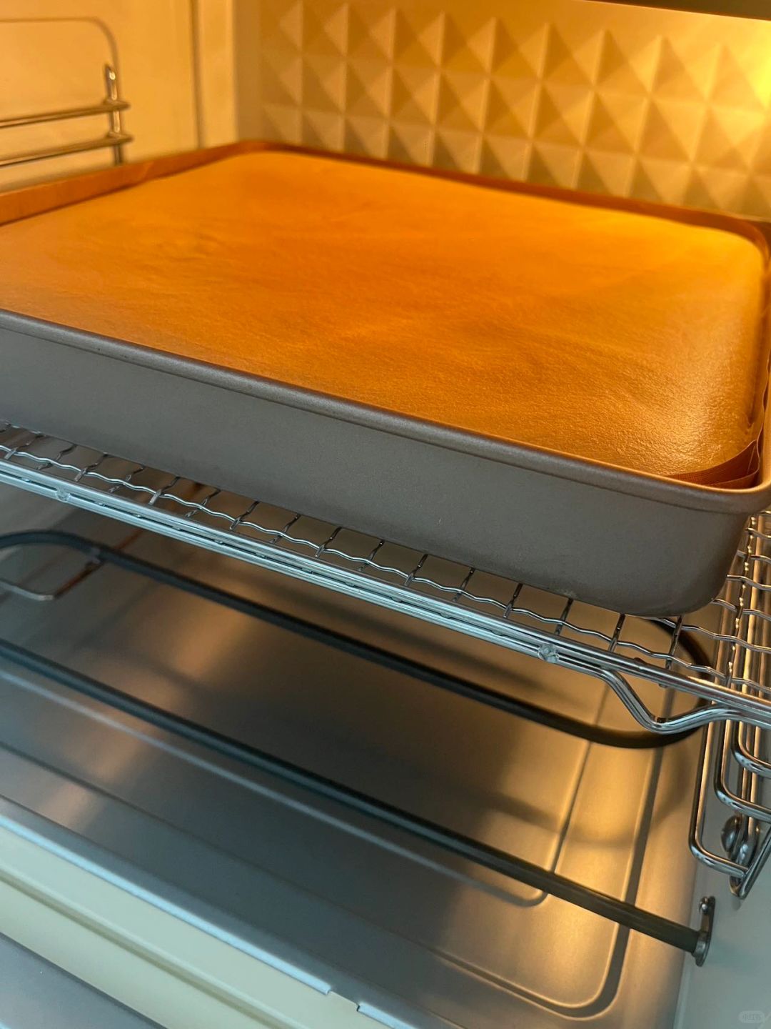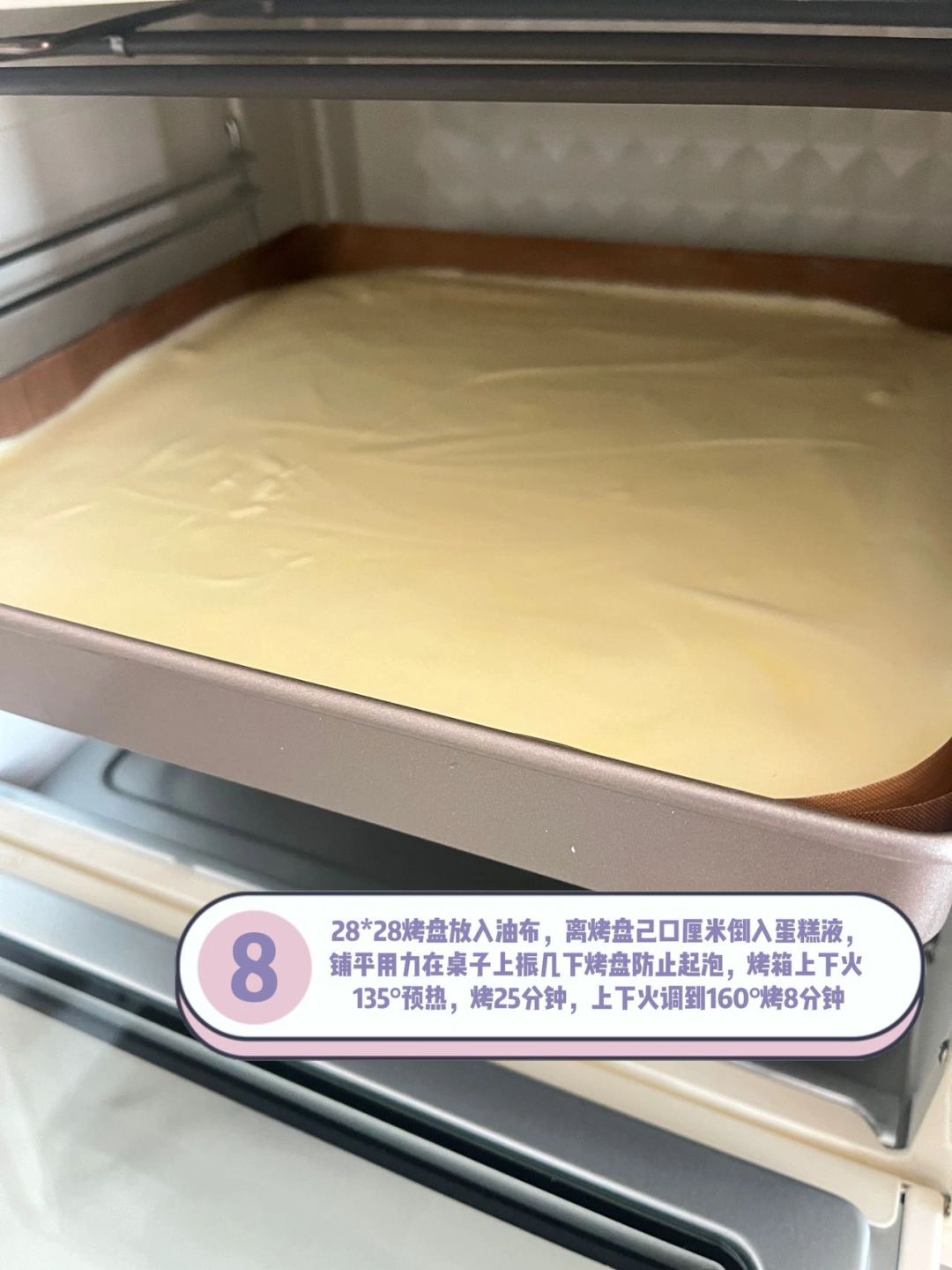 5、28*28烤盘放入油布,20cm高倒入蛋糕液,铺平震动几下,震出气泡