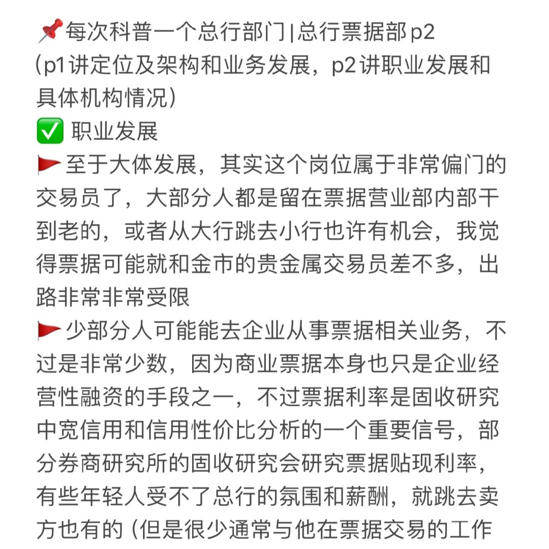 🚩少部分人可能能去企业从事票据相关业务,不过是非常少数,因为商业票据本身也只是企业经营性融资的手段之一,不过票据利率是固收研究中宽信用和信用性价比分析的一个重要信号,部分券商研究所的固收研究会研究票据贴现利率,有些年轻人受不了总行的氛围和薪酬,就跳去卖方也有的(但是很少通常与他在票据交易的工作履历也无关主要是他之前有实习经历,然后那边正好缺个研究员)