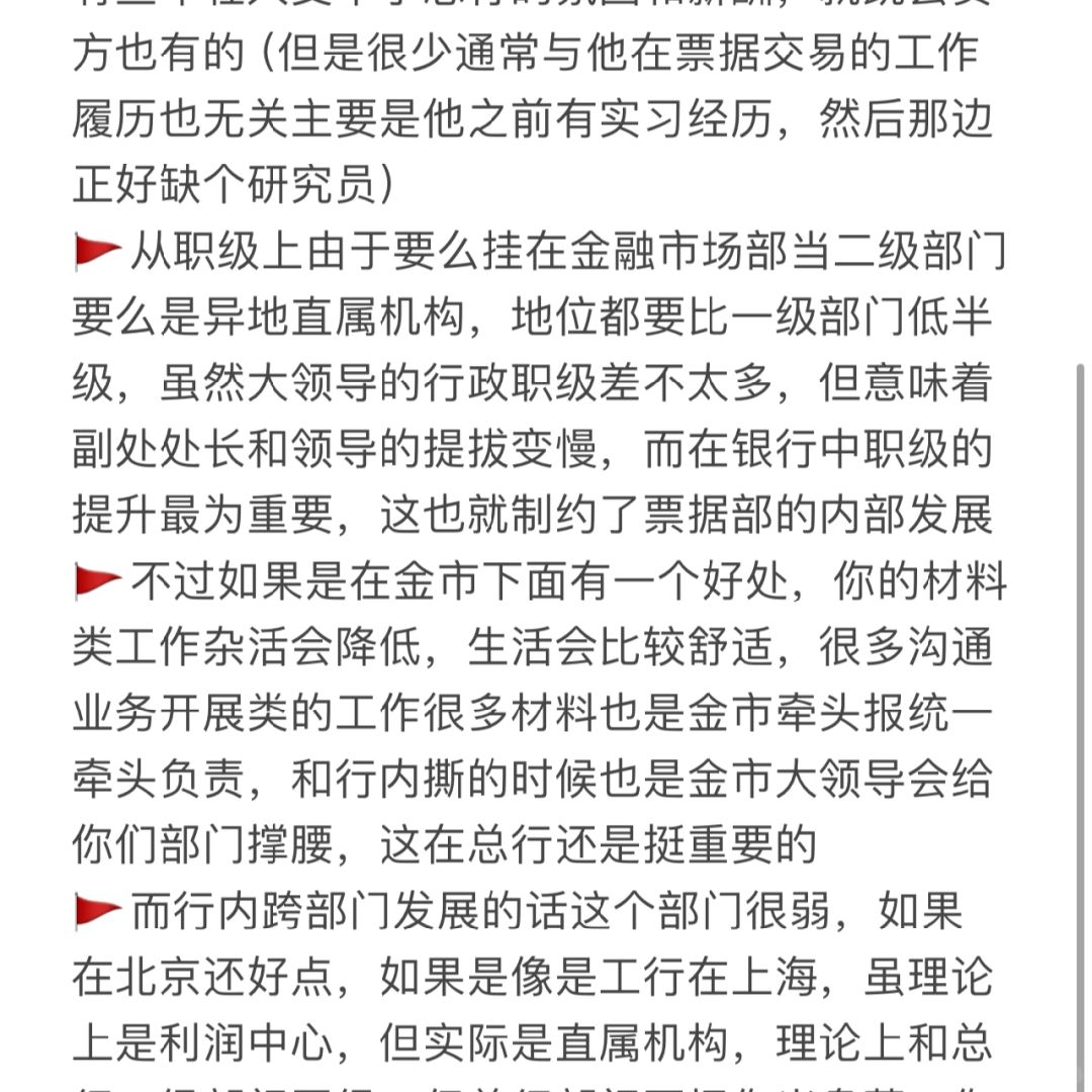 🚩从职级上由于要么挂在金融市场部当二级部门要么是异地直属机构,地位都要比一级部门低半级,虽然大领导的行政职级差不太多,但意味着副处处长和领导的提拔变慢,而在银行中职级的提升最为重要,这也就制约了票据部的内部发展