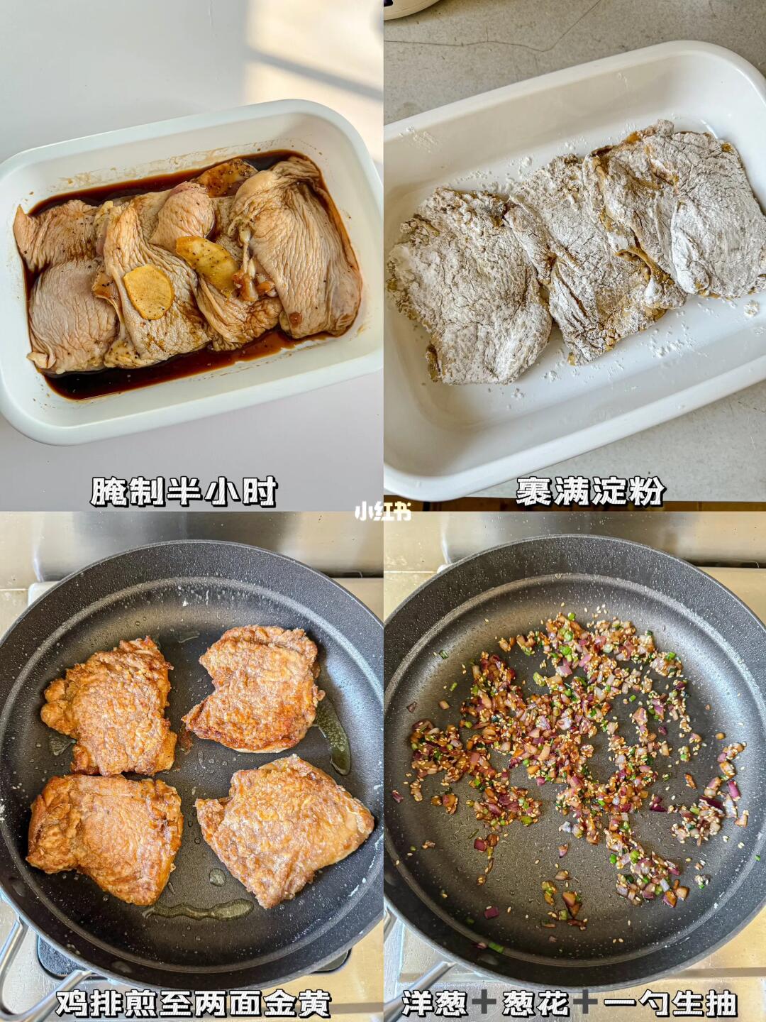外脆里嫩 鲜嫩多汁 超级简单,拌饭吃特别香 🗒️食材:鸡腿肉/洋葱/葱花 👩🏻🍳制作: 1️⃣去骨鸡腿肉➕两勺生抽➕一勺料酒➕一勺蚝油➕黑胡椒海盐➕姜片,腌制半小时 2️⃣腌制好的鸡腿肉裹上玉米淀粉 3️⃣平底锅喷油煎鸡排,中小火🔥每面大概煎4-5分钟 4️⃣洋葱丁➕葱花(喜欢生姜的可以加点姜末)➕一勺生抽➕白芝麻,炒香 5️⃣鸡排盖在米饭上,淋上鸡排上