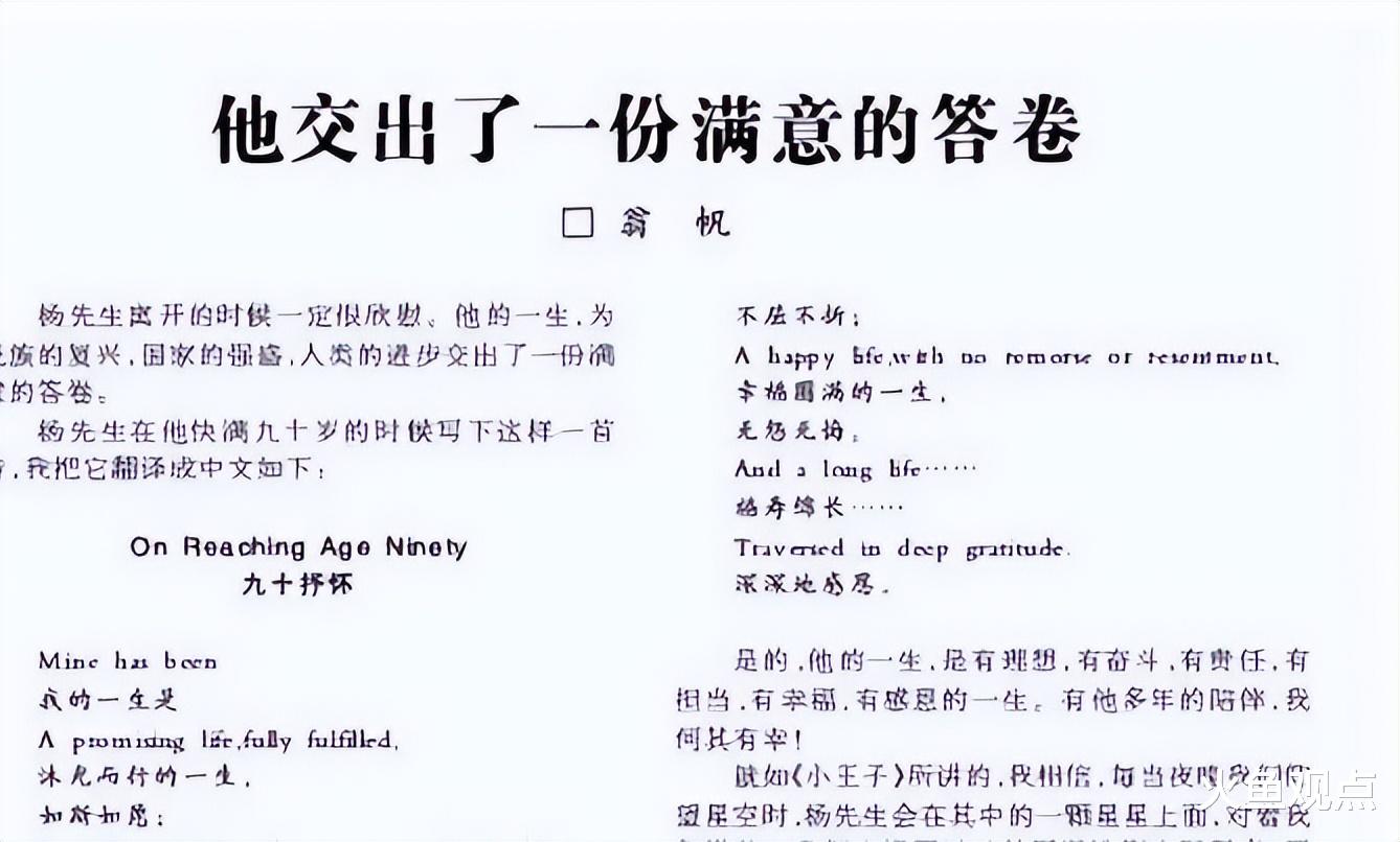 撰文中,有杨振宁的一首短诗《九十抒怀》,