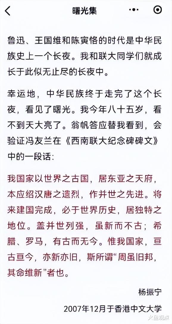 11年后,杨振宁又发表《晨曦集》,书中写道: