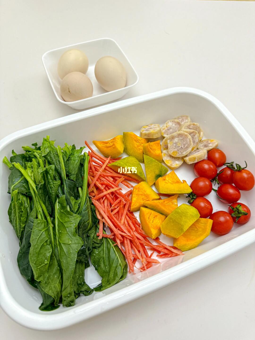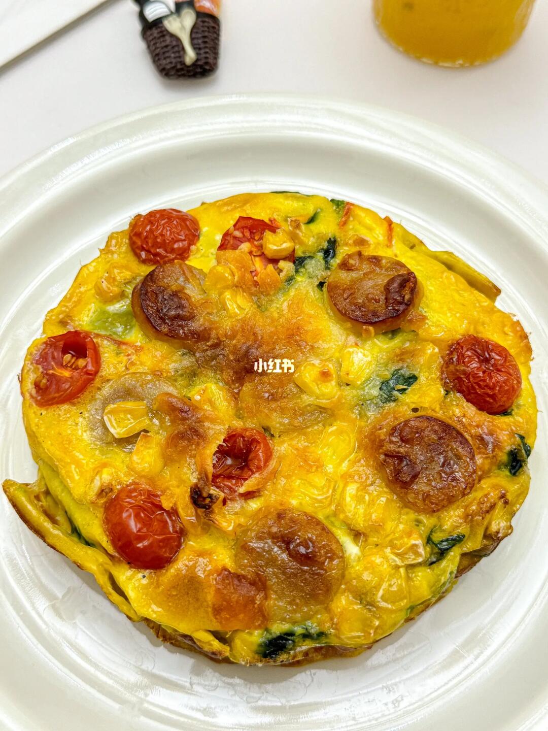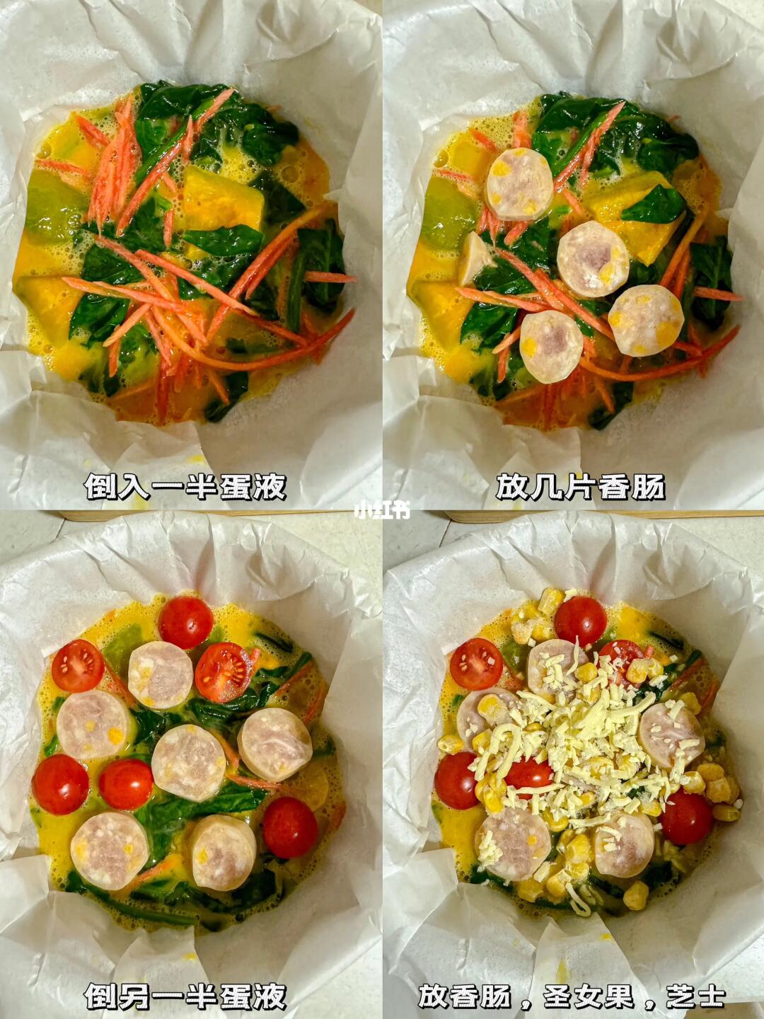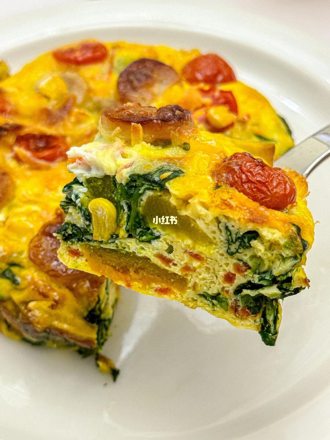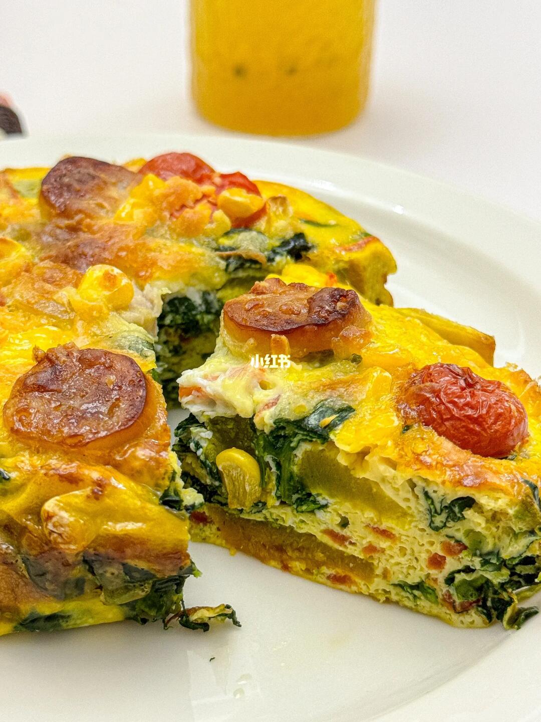 低卡饱腹 减脂期爱吃的厚蛋烧🎃 🧡制作: 1️⃣蛋液:三个鸡蛋➕盐➕玉米淀粉 2️⃣菠菜焯水,南瓜煮熟 3️⃣将南瓜,菠菜,胡萝卜丝搅拌均匀 4️⃣先倒一半蛋液,放几片烤肠,再倒入蛋液,放入烤肠,圣女果,玉米粒和马苏里拉芝士 5️⃣烤箱180度烤40分钟