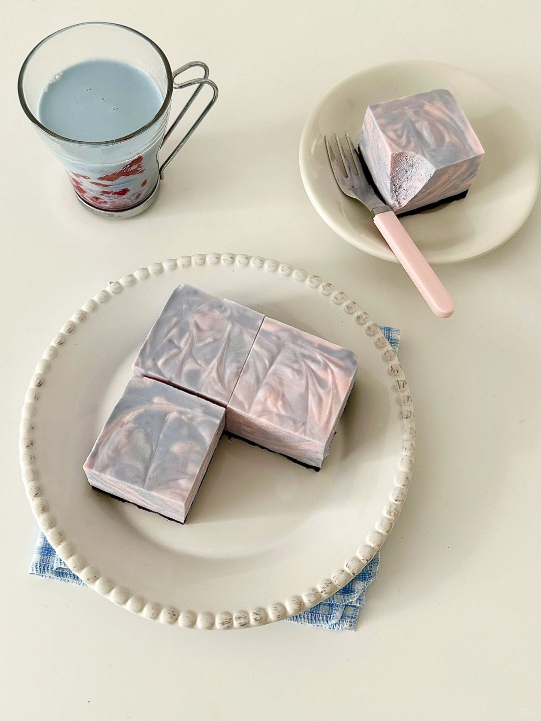 5️⃣蝶豆花粉和草莓粉,加一点牛奶搅拌成糊,加入到两份奶酪糊中混合