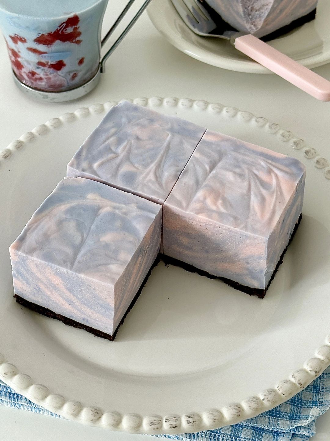 6️⃣蓝色奶酪糊倒在粉色中拌两下(只拌两下哦),然后倒入饼干底模具中,用牙签整理表面纹路,冷藏4小时以上至凝固即可