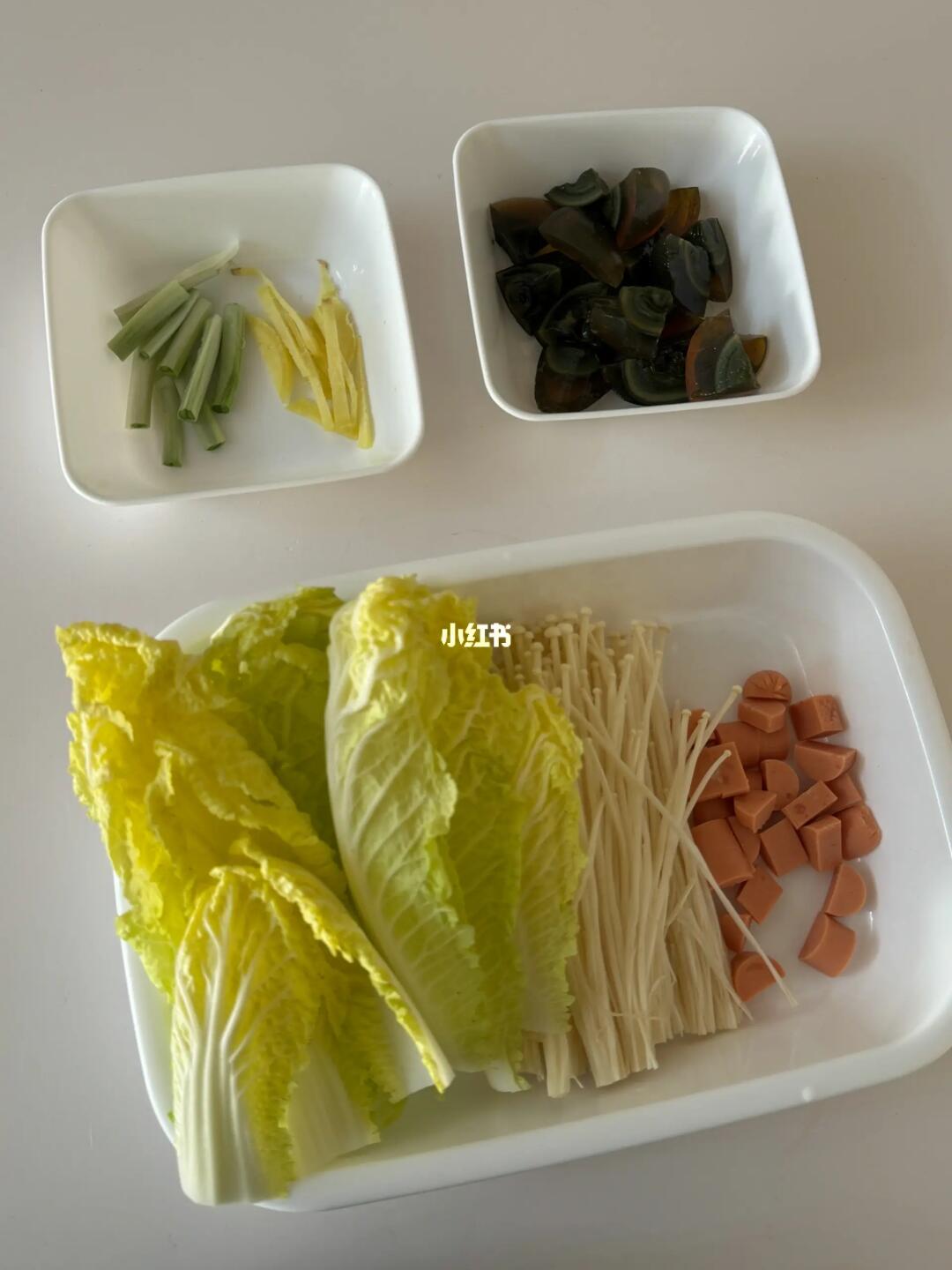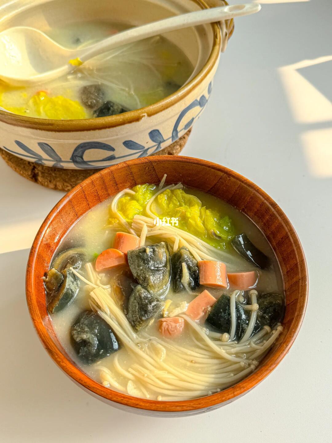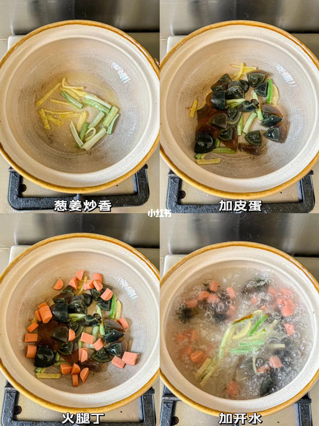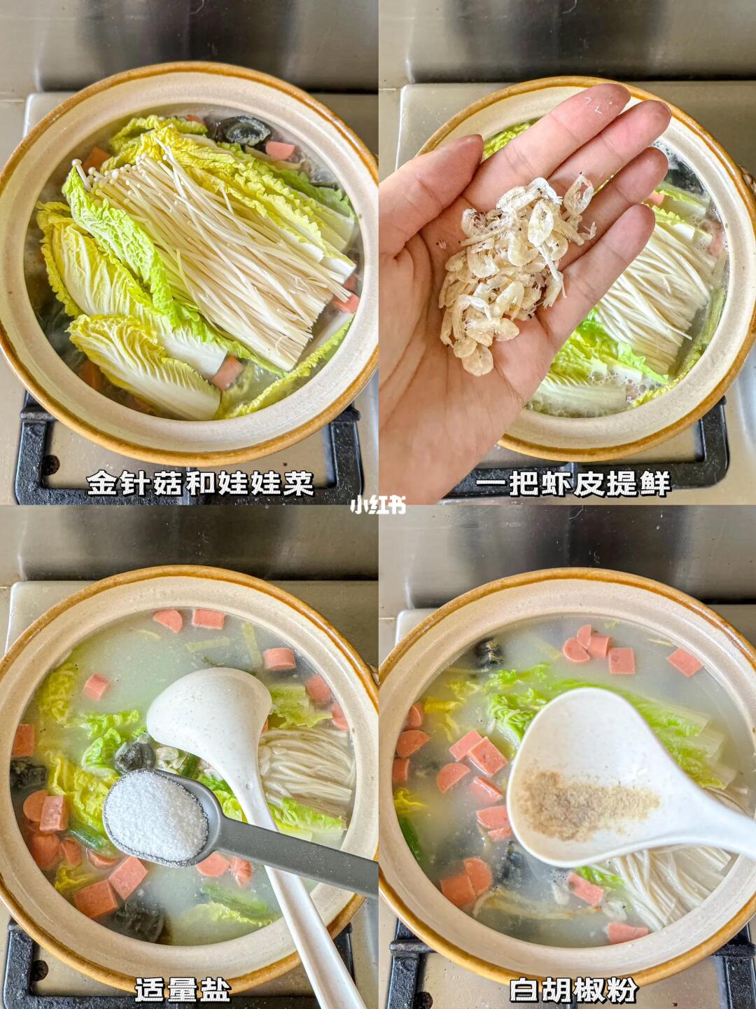 百喝不厌的汤 简简单单却非常鲜美 🗒️食材:娃娃菜/金针菇/皮蛋/火腿/葱姜/虾皮 👩🏻🍳制作: 1️⃣葱姜炒香➕皮蛋➕火腿翻炒 2️⃣加开水 3️⃣放娃娃菜和金针菇 4️⃣一把虾皮提鲜,加盐和白胡椒粉调味