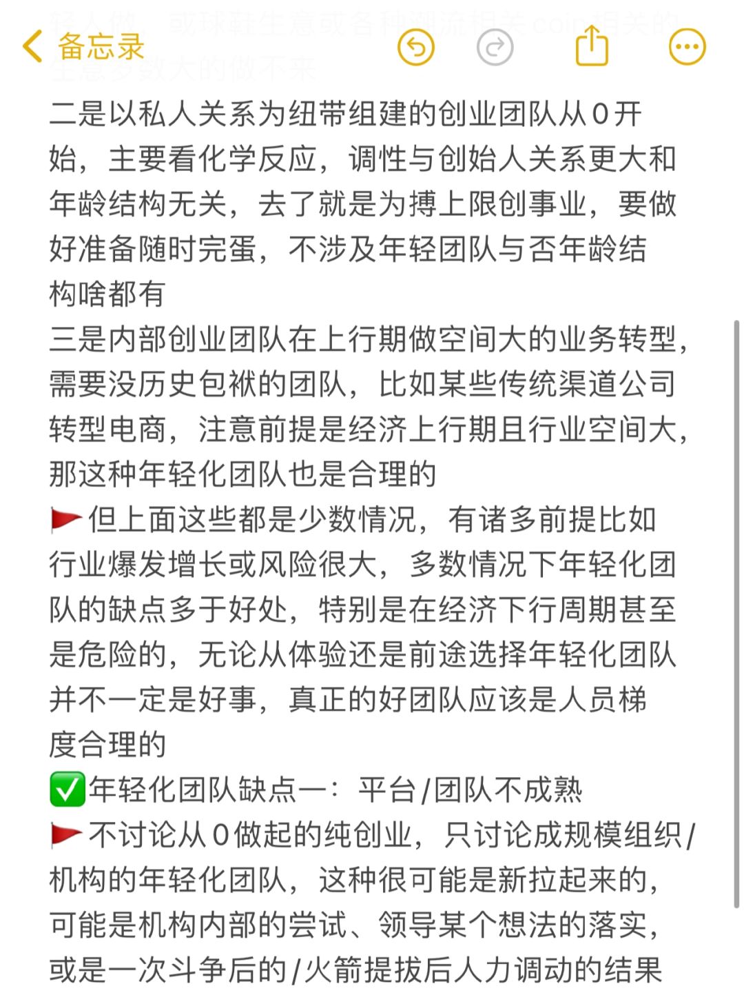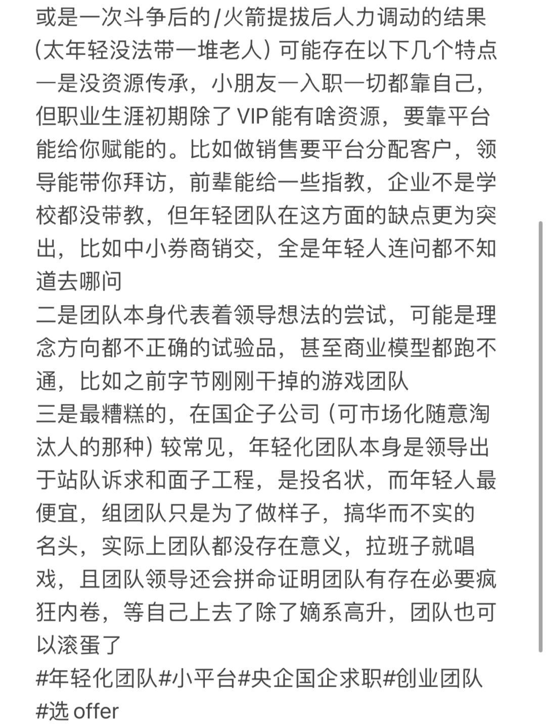 🚩年轻化固然有好处,比如理念较新,性格好爱带人的年轻领导没架子无代沟,还有因处于特定阶段的组织/业态自然而然产生的年轻化团队