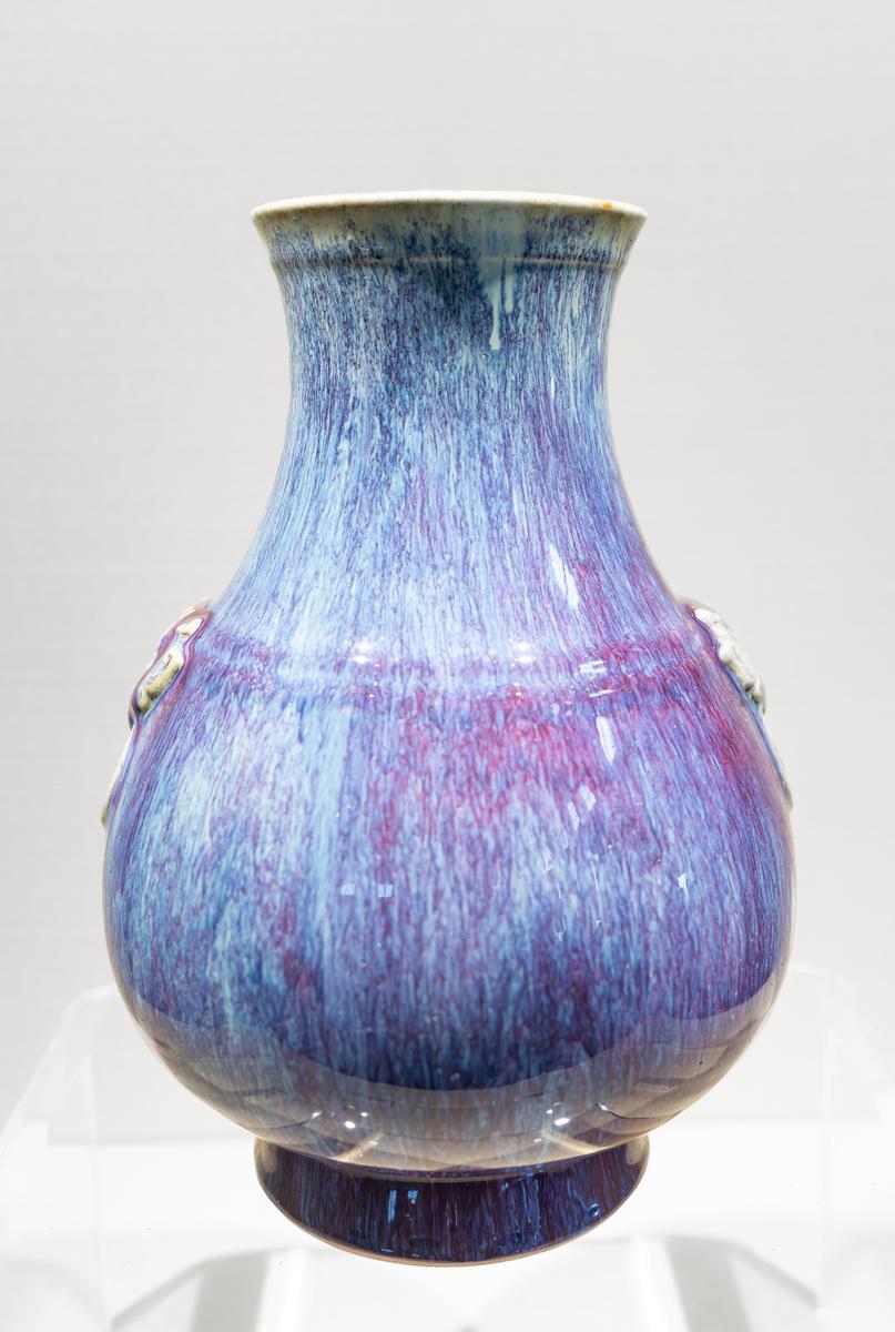 与同期汝窑常见缩釉、器型微瑕的情况不同,这件钧窑瓶展示了惊人的稳定性。其月白釉底上自然流淌的紫红斑块,实则是工匠们以氧化铜为着色剂,在1300℃窑火中创造的化学魔术。这种技术直到18世纪欧洲仍无法复刻,而中国匠人在北宋就已掌握让金属氧化物在釉层中自由呼吸的秘诀。