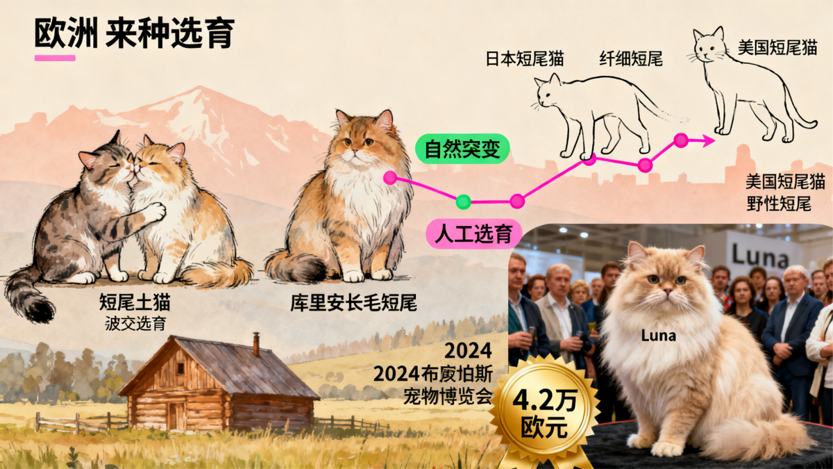 一、品种起源:自然演化与人工选育的双重馈赠“库里安长毛短尾猫” 这一名称尚未见于 WCF、TICA 等国际猫协的官方品种名录,结合其 “长毛”“短尾” 的核心特征及名称中的 “库里安”(疑似地域或培育者关联),推测其可能是起源于东欧或中亚地区的自然变异猫种,或由短尾猫与长毛猫杂交培育的新兴品种,其演化轨迹与两类短尾猫品种存在密切关联。