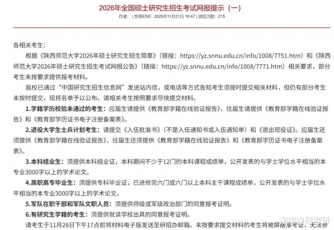 陕西师范大学发布了2026年全国硕士研究生招生考试网报提示,请考生于11月28日下午17点前将材料电子版发送至研招办邮箱。未按要求提交材料的考生将被屏蔽准考证,无法参加考试。