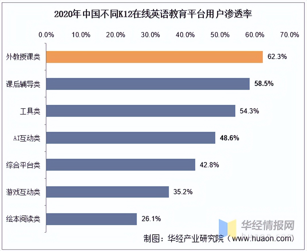 2020年(1-10月)不同类别K12在线英语教育平台中,外教授课类平台得益于重视外教一对一辅导教学,推出多元化教学模式,口语效果好,用户渗透率最高,达62.3%;课后辅导类平台侧重于学生日常考试学习,用户渗透率位列第二,为58.5%;而工具类则多是英语单词、语法的自主学习,用户渗透率排在第三位。