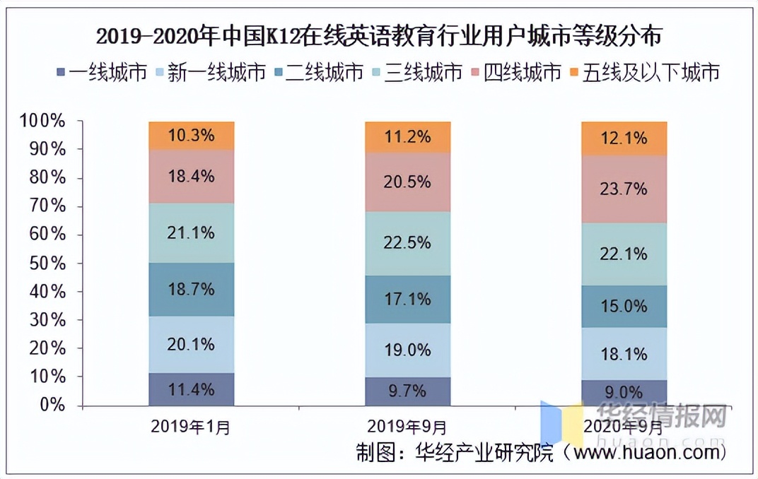 从K12在线英语教育行业用户的城市等级分布情况来看,向下沉城市发力,2020年9月三线及以下城市的占比增长了8.1个百分点(对比2019年1月),其中,四线城市增长最为显著,从18.4%至23.7%,增长5.3个百分点。
