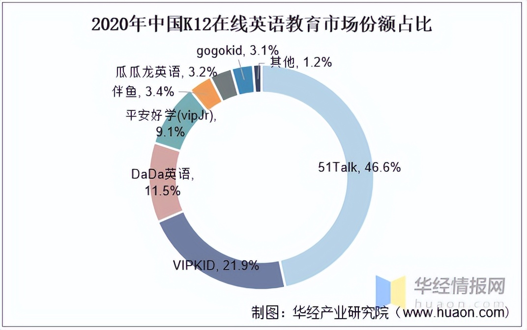 中国K12在线英语教育行业集中度较高,2020年51Talk的市场份额以46.6%大幅领先,占据将近一半的市场份额,优势显著;其次是VIPKID(21.9%)、DaDa英语(11.5%)和平安好学(vipJr)(9.1%);整体来看,行业用户向头部品牌集中。
