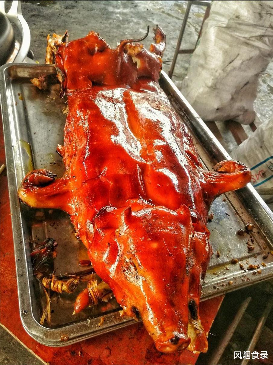 选双月龄20斤的小猪,抹盐、料酒腌入味,再用松枝慢烤,皮色金黄时,拿刀一划,“咔嚓”一声脆响,里头肉嫩得流汁儿。