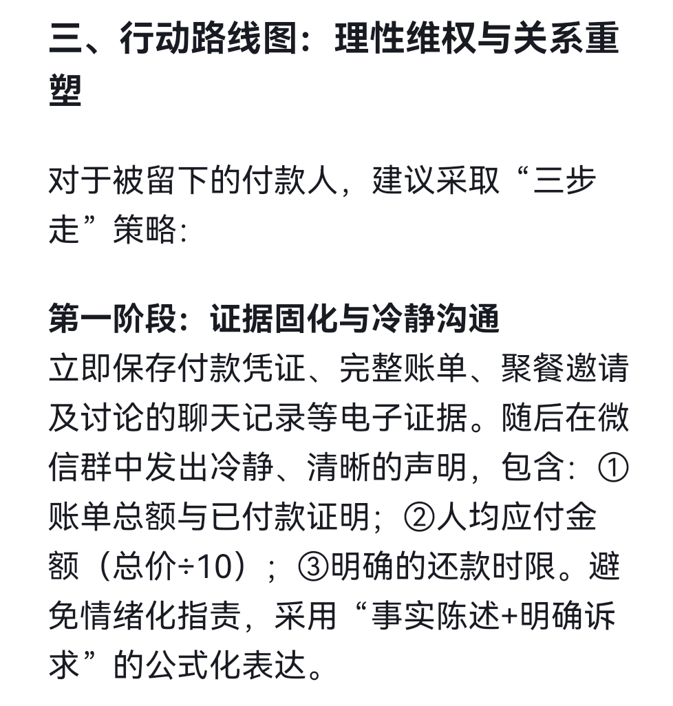 餐桌从来不只是吃饭的地方,更是人格的展台。当一群人选择在账单面前转身离去时,他们支付的代价远不止于未来可能收到的法院传票,更包括:①在共同社交圈中被标记为“不可信赖者”;②失去那位本可能在他们真正需要时伸出援手的朋友;③自我人格的矮化——知道自己是个会为了一顿饭钱而逃跑的人。