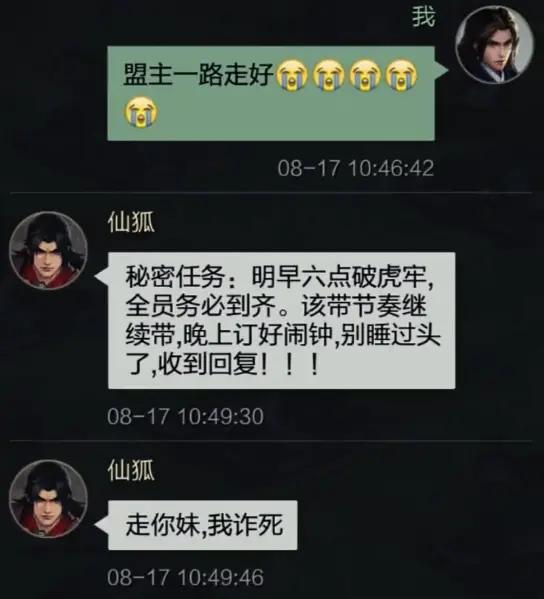 就在大家沉浸于悲痛中时,仙狐在内部群突然“诈尸”:“走你妹,我装的!明早六点破虎牢,都给我到位!”这波操作,堪称“寿衣渡江”。