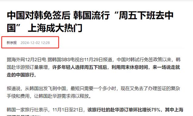 (信源:新京报2024年12月2日—中国对韩免签后 韩国流行“周五下班去中国” 上海成大热门)