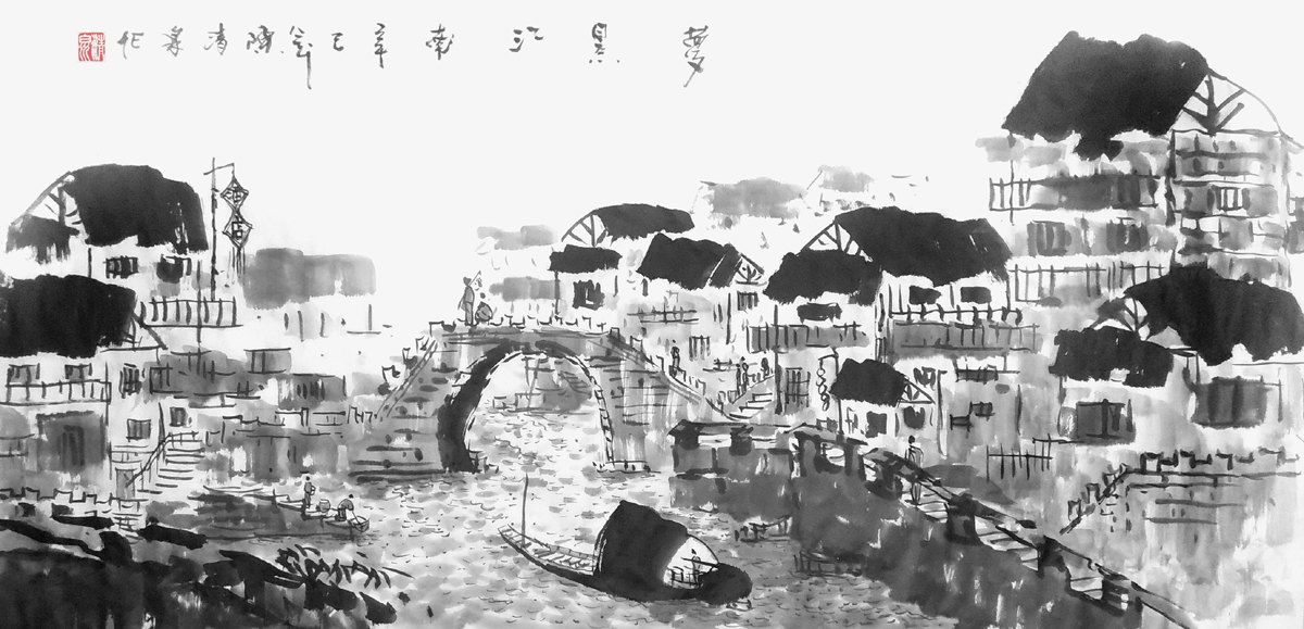 陈清泉的水墨画作品《梦境江南》,以传统水墨为核心,强调“师法自然”与“书画同源”。其笔墨简淡而不失层次,线条灵动如书法,通过皴擦、点染表现山水的气韵生动。例如,《春意山河韵神州》以纯粹黑白模式勾勒山河,摒弃色彩却以笔墨浓淡展现四季韵律,体现“天人合一”的哲学思想。