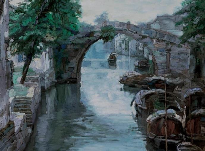 陈逸飞的《周庄》以西方古典写实主义为基础,结合美国照相写实主义的细腻手法,通过厚涂、晕染与光影处理,营造出色彩斑斓的梦里水乡。画面以运河为中心,水天一色,明暗对比强烈,但色块构成趋于平面化,形成主观浪漫的视觉效果。