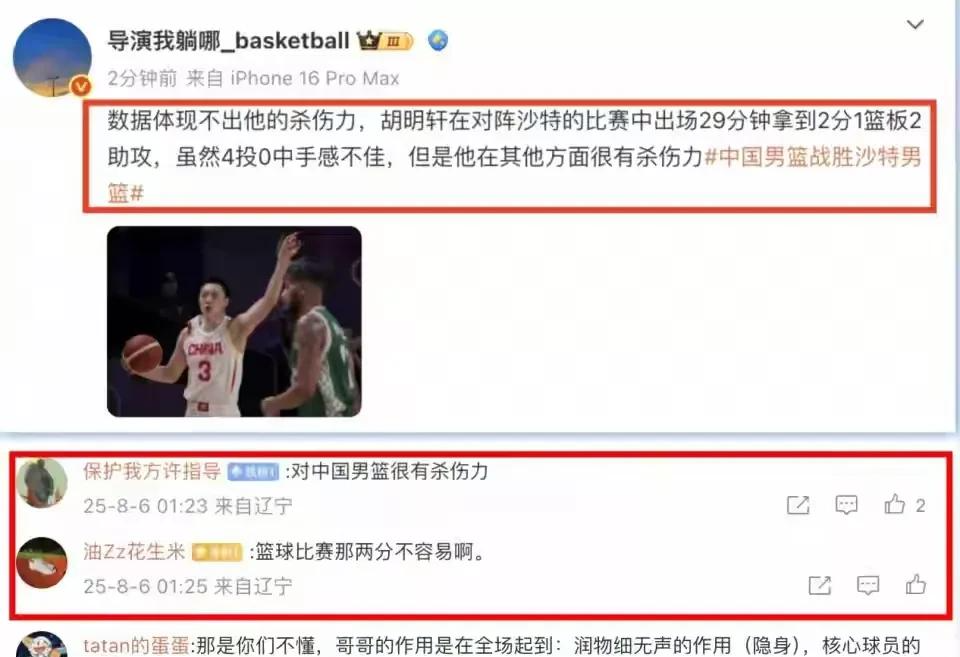 在本场比赛之前,对于不少黑粉来说,他们对中国男篮的输赢抱无所谓的态度,唯一的目的就是抨击胡明轩。因此他们早早就摆好了姿势,想好了段子,写好了文案打算再次抨击胡明轩。