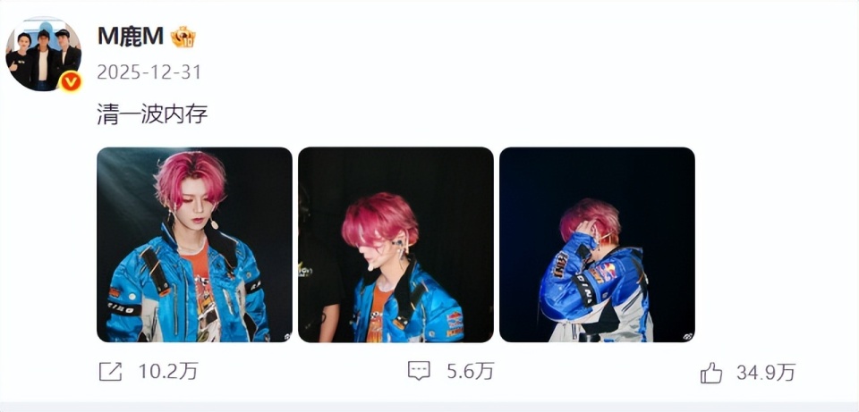 跨年夜那天,小鹿在社交平台发了一组之前的舞台照,他穿着蓝色亮面外套,里面是件橙色内搭。