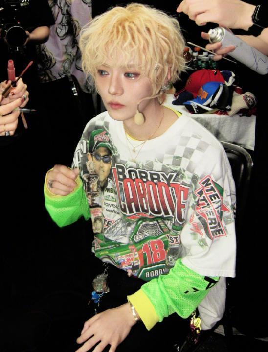 他的头发染成了树莓红,整套装扮非常炫彩,第二组照片他的头发变成了金色,搭配的妆容很有混血感。
