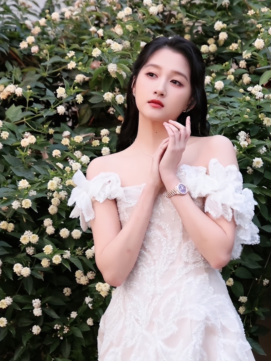 她的身上没有夸张的首饰,款式都比较简约,半扎的马尾看上去很优雅,她拍了几组外景照片。