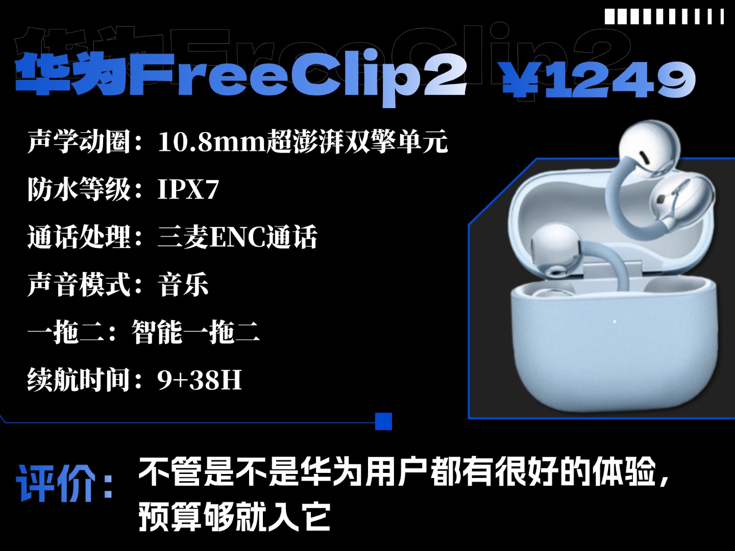 其他配置也很能打:单耳 5.1 克,加上耳夹独特的三段式结构设计,戴起来又稳又舒服,佩戴感我觉得能打满分。续航也够长,9+38 小时的总续航,哪怕几天不充电也不用担心没电。另外,它还有 IP57 超高级别的防尘防水、头动交互这些实用功能,预算够的话,不管你是不是鸿蒙用户,选它都不亏。
