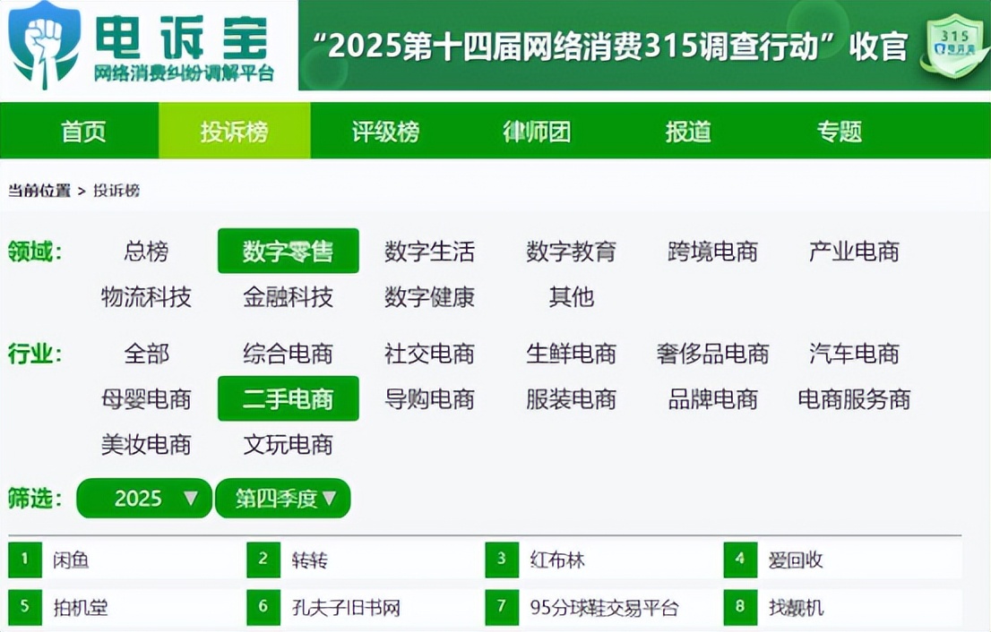 投诉量依次为:闲鱼、转转、红布林、爱回收、拍机堂、孔夫子旧书网、95分球鞋交易平台、找靓机。