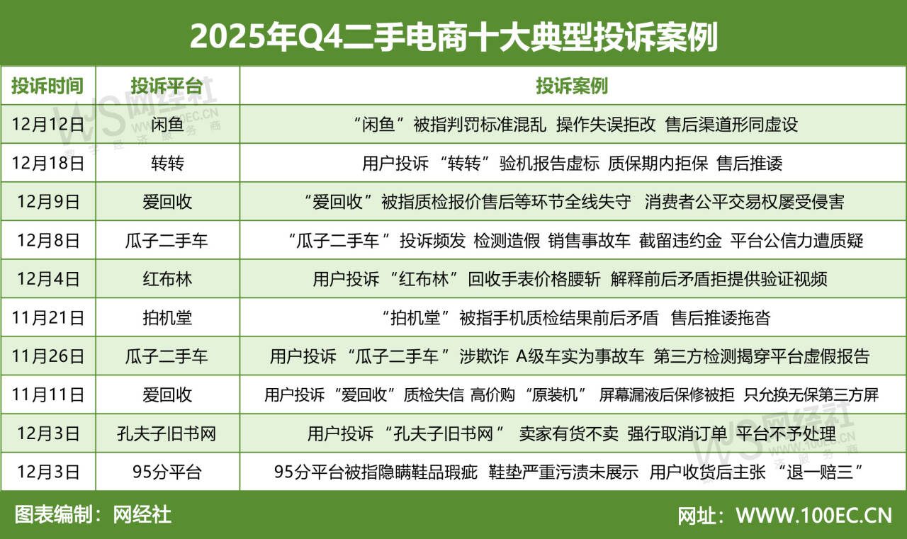 2025年第四季度,二手电商消费纠纷呈现高频化、典型化特征。行业在交易关键环节的普遍短板:“货不对板”与“成色争议”成为商品质量类投诉焦点;奢侈品、电子产品等高价物品的“鉴定瑕疵”与“回收压价”问题凸显信任危机;而“退款拖延”、“保证金难退”等则反映出平台售后机制与规则执行仍不完善。