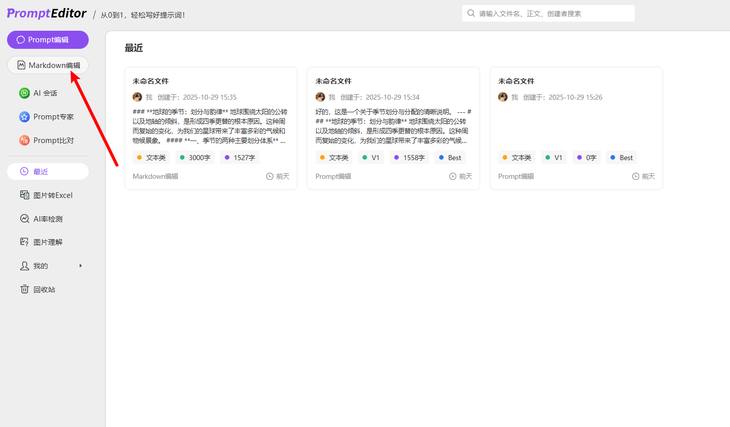接下来,就让我们一步步了解具体如何操作:打开 PromptEditor编辑器网站,登录后点击进入「Markdown编辑」模块;