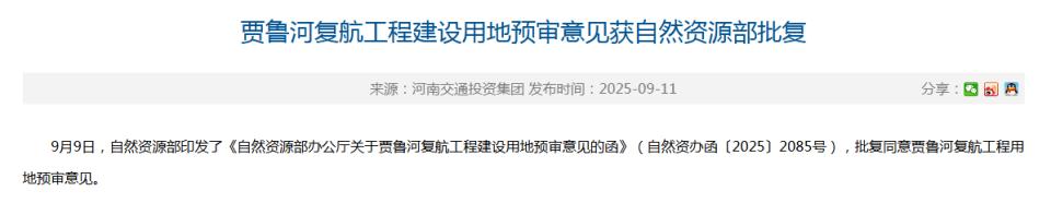 贾鲁河复航,又迎来关键节点:近日,河南交通投资集团发布消息称,贾鲁河复航工程建设用地预审意见获自然资源部批复,为项目年内开工建设奠定了坚实基础。